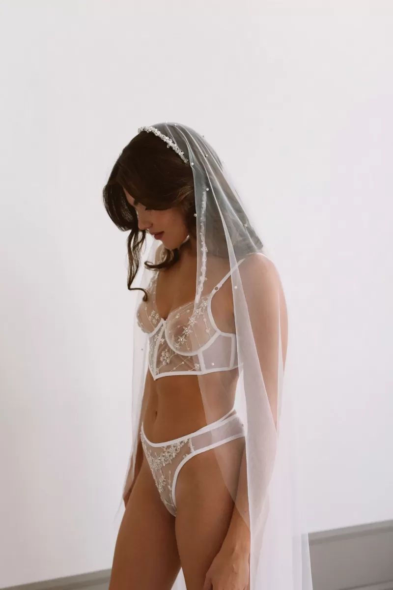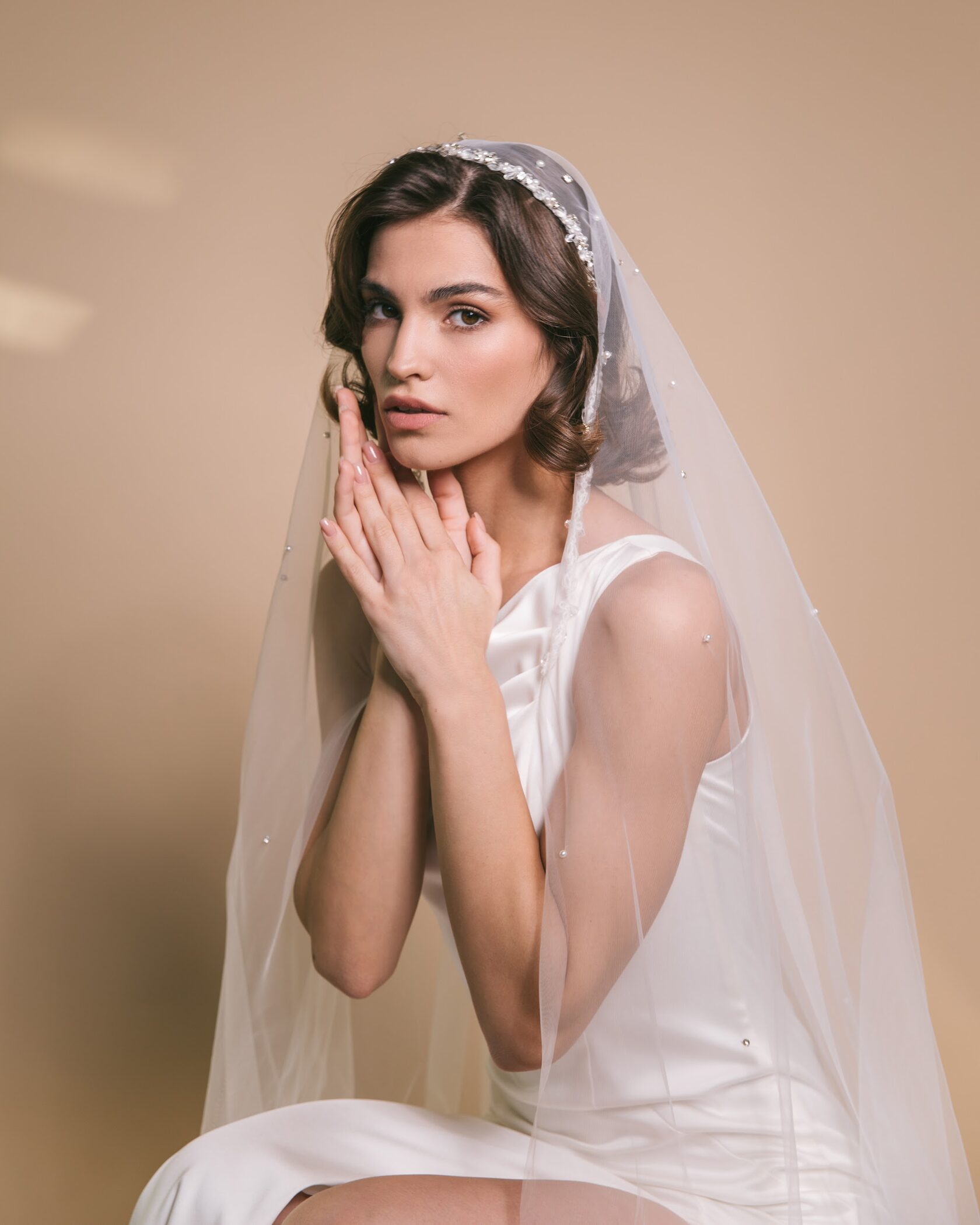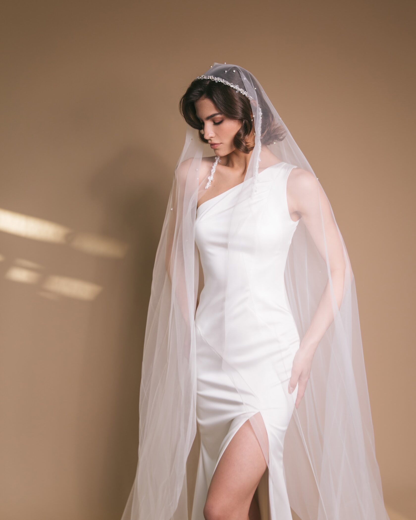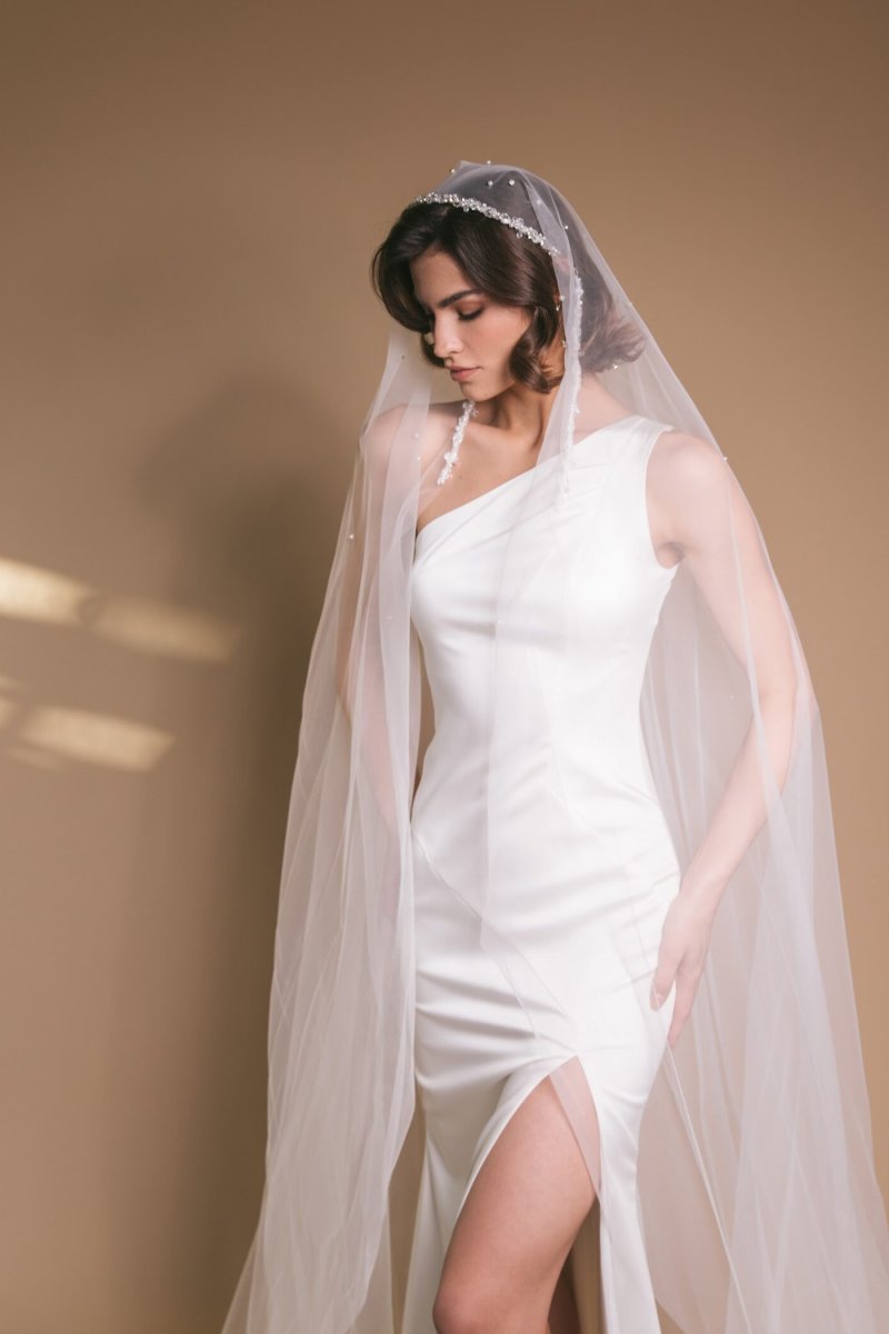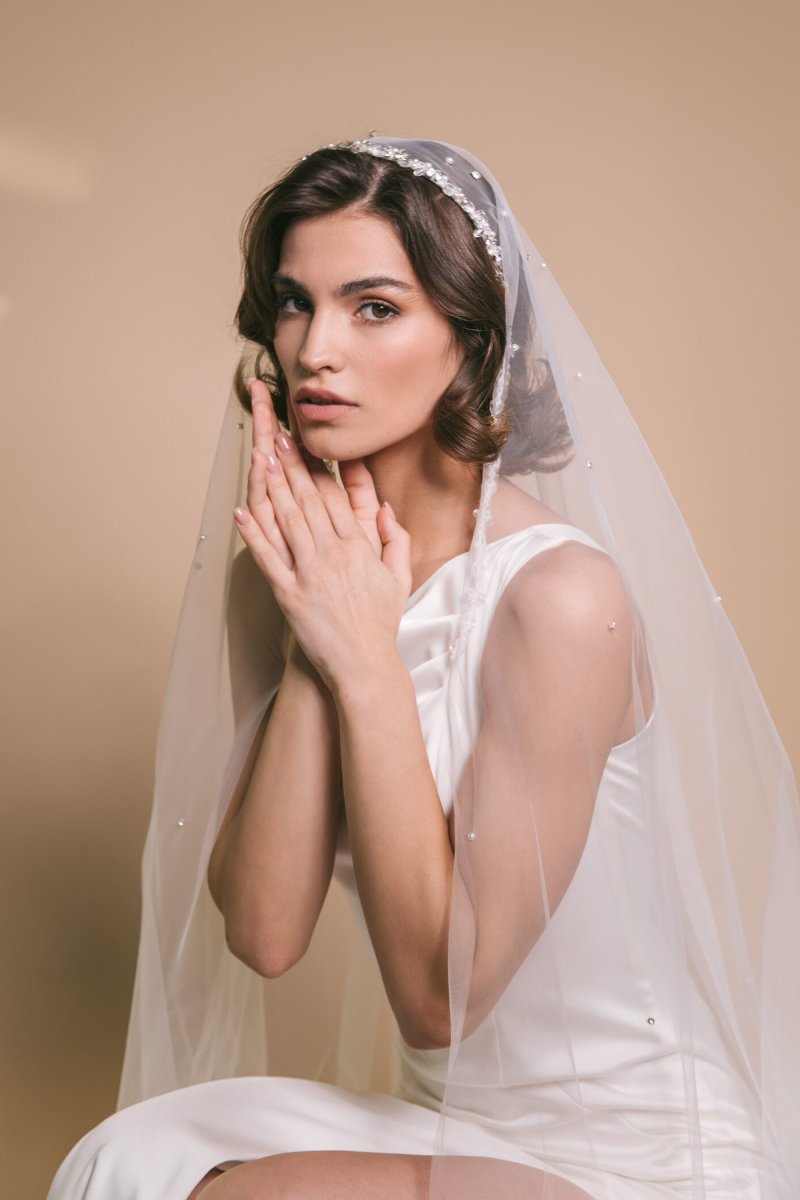 Длинная фата с ободком, украшенным стразами — удобное и стильное крепление.
