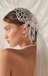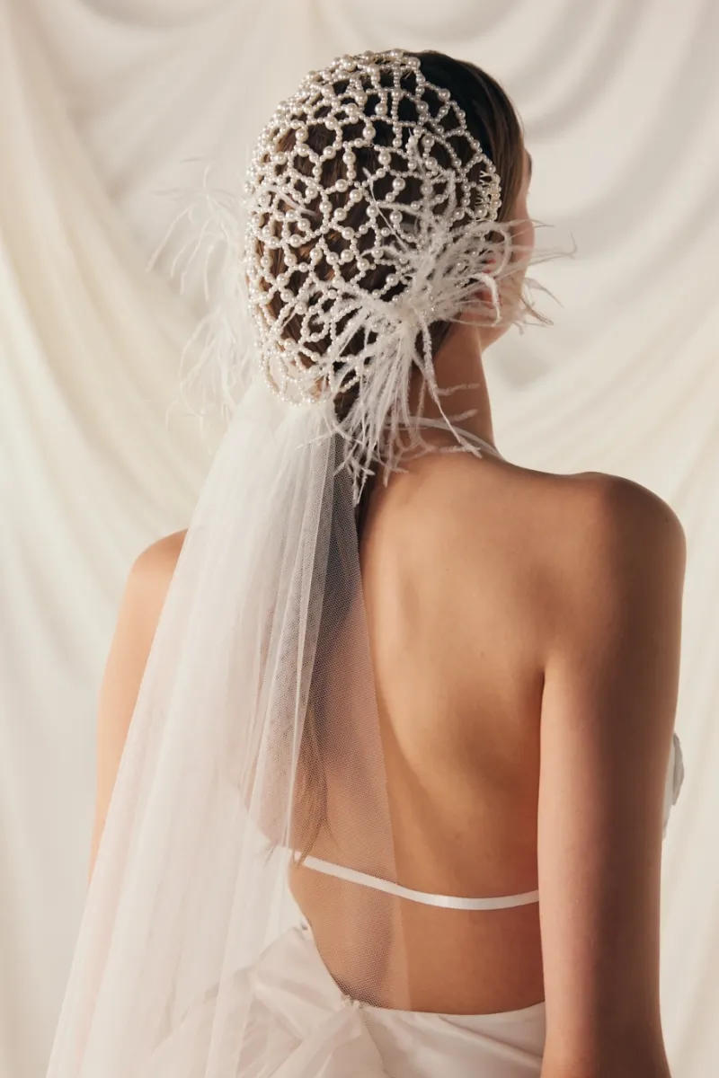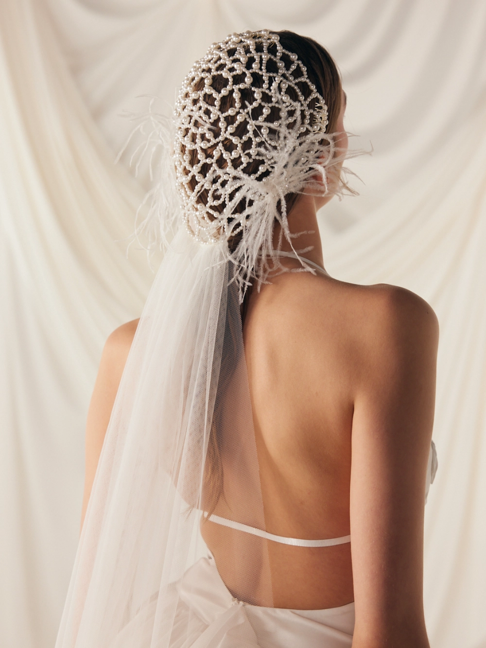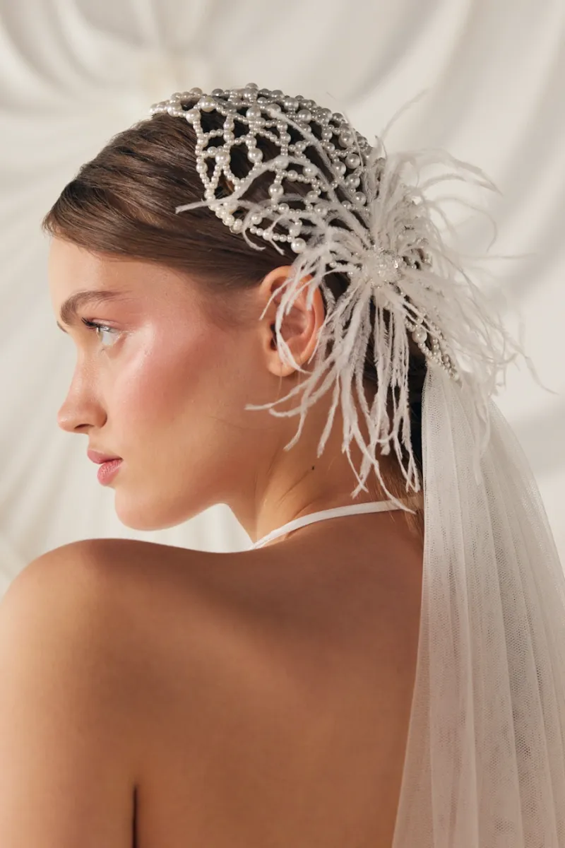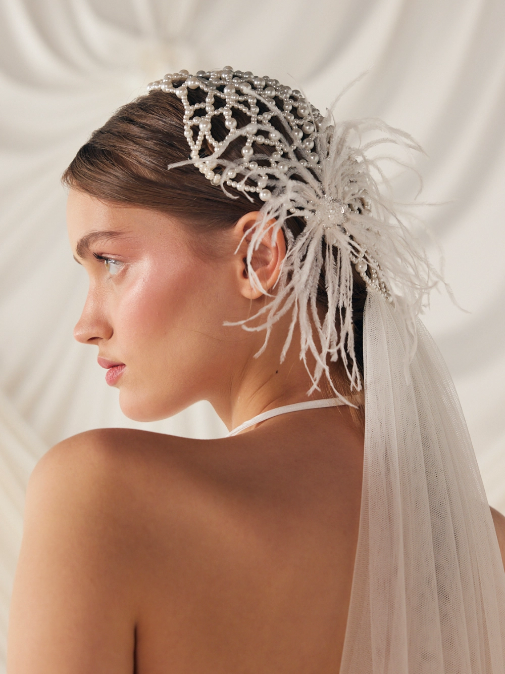 Фата с расшитой сеткой и перьями. Основание украшено сеткой из жемчужных бусин, дополнено тонкими перьями. Средняя длина и мягкая драпировка подчёркивают линию плеч и шею.