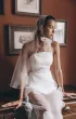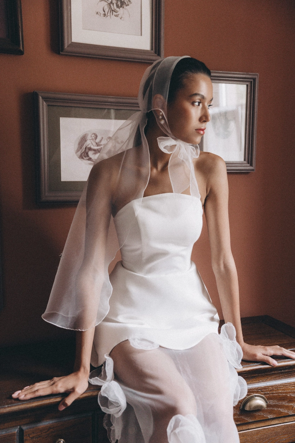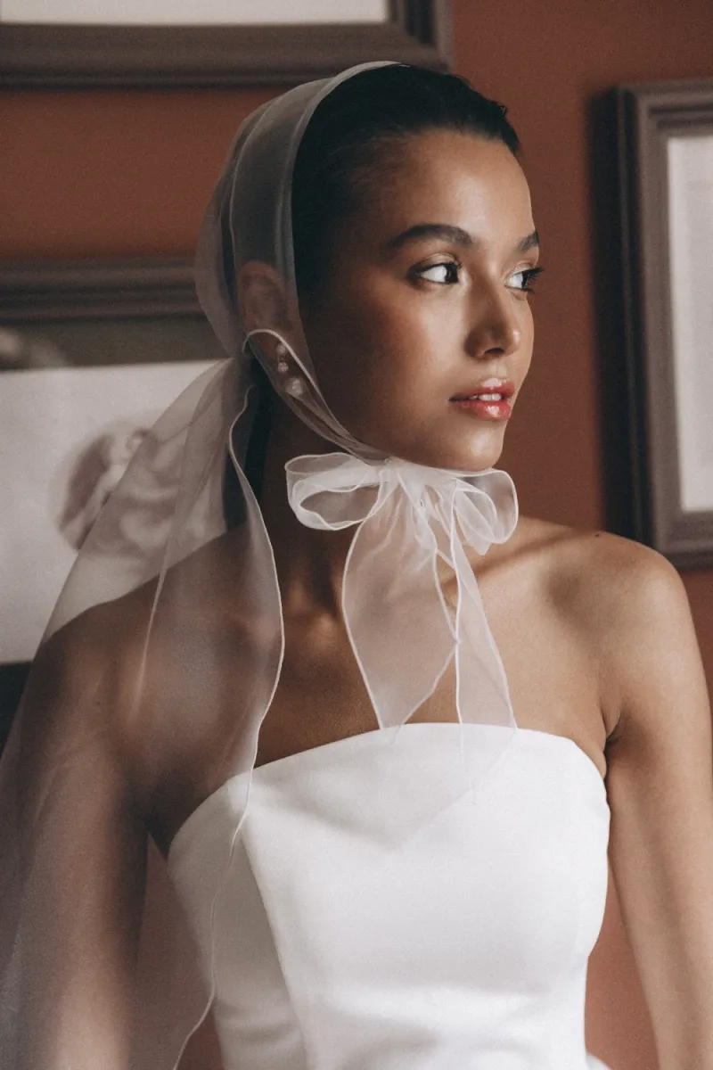 Чепчик-накидка из полупрозрачной органзы с мягким шлейфом. Завязывается широкими лентами под подбородком, создавая эффект лёгкой вуали. Элегантная альтернатива фате с ноткой ретро и кинематографичности. Хорошо смотрится в минималистичных образах, на съёмках и церемониях.