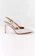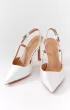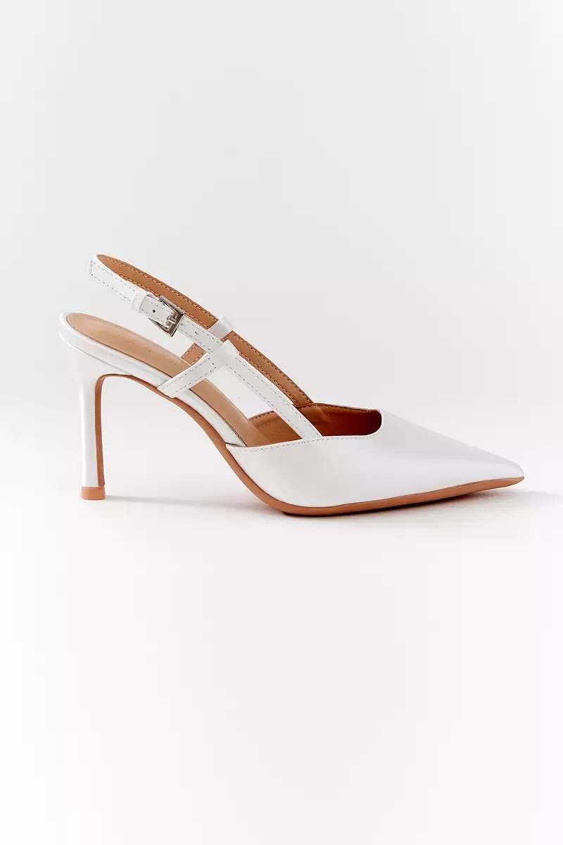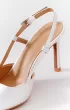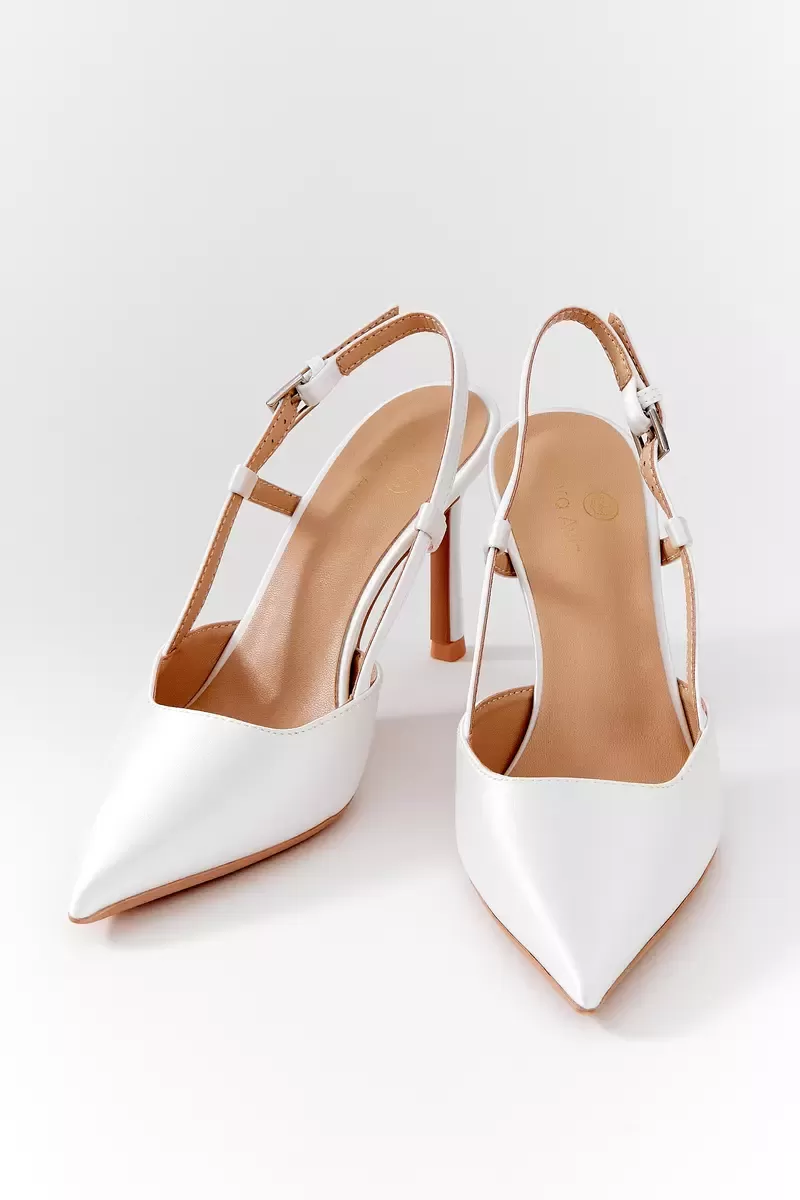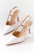 Оригинальные босоножки с закрытым носком на среднем каблуке. Фиксирующий ремешок, проходящий от носка до пятки, придает модели элегантный силуэт.