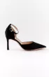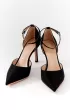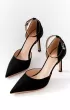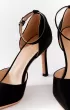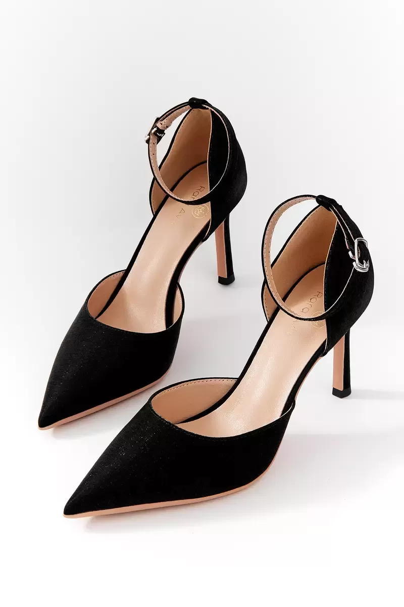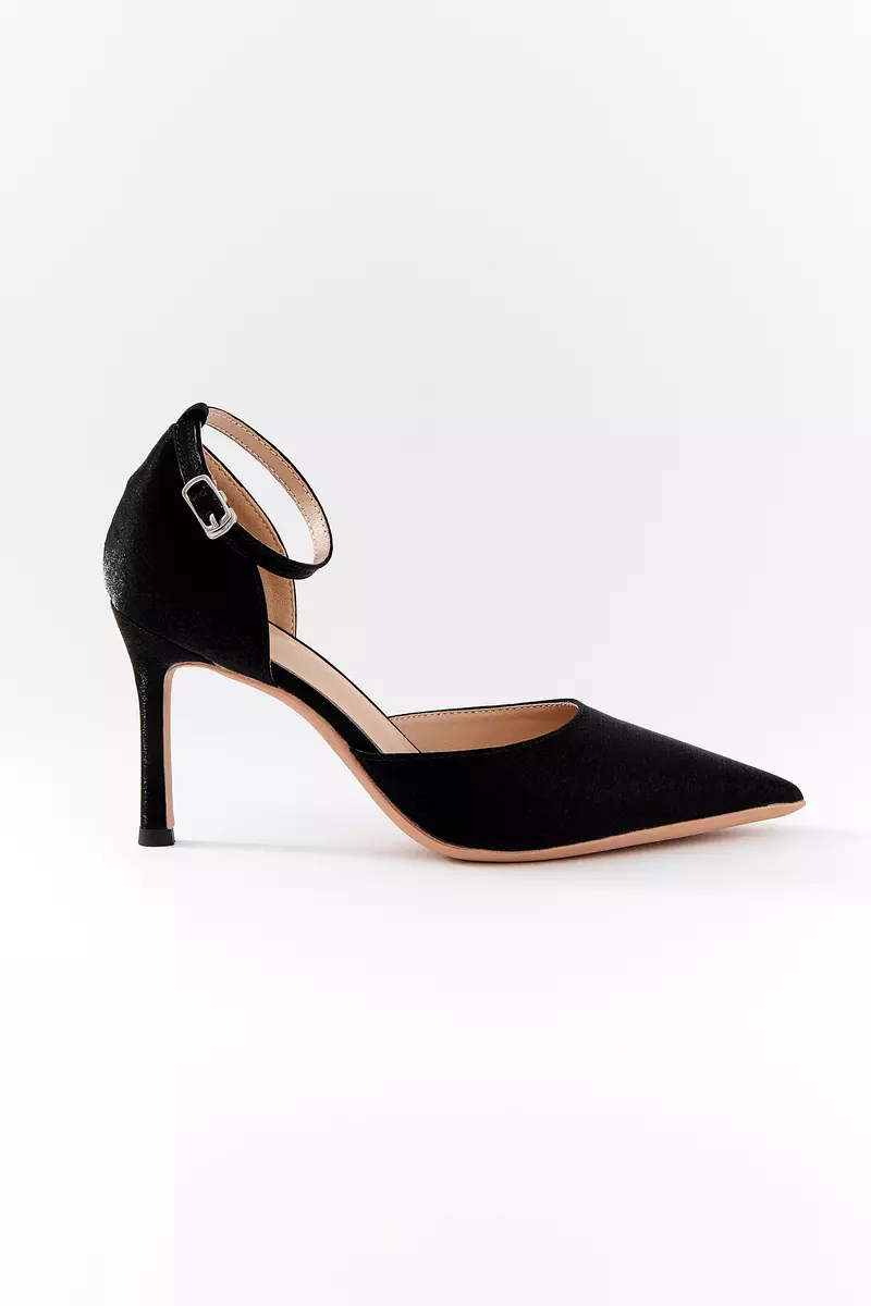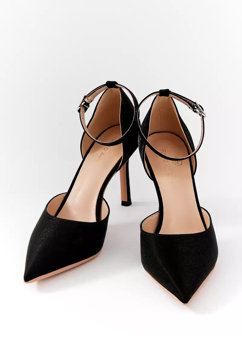 Полуоткрытые чёрные лодочки–босоножки с фактурным блестящим верхом. Тонкий щиколоточный ремешок надёжно фиксирует стопу. Отличный выбор для вечера.