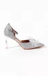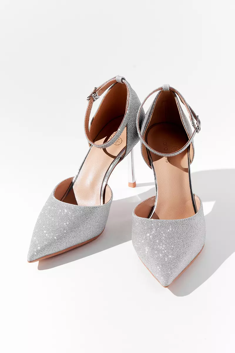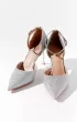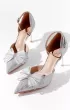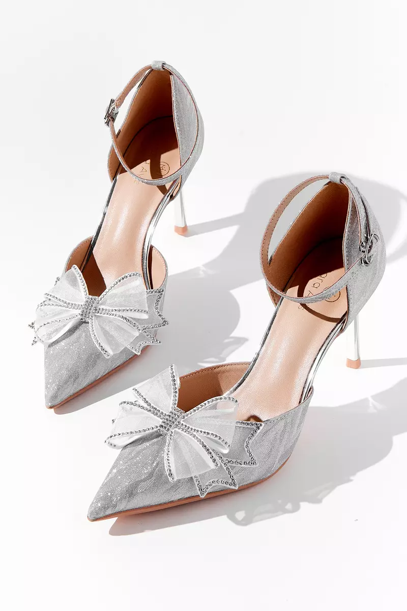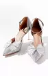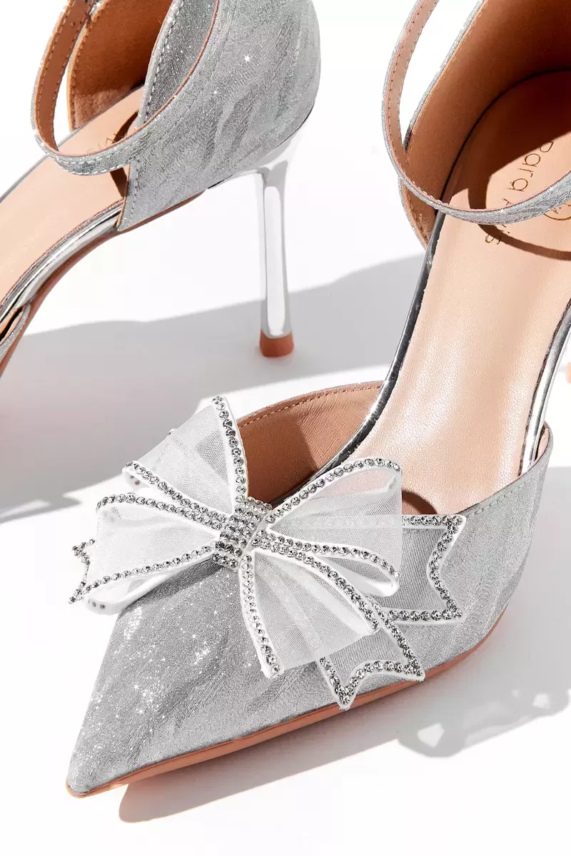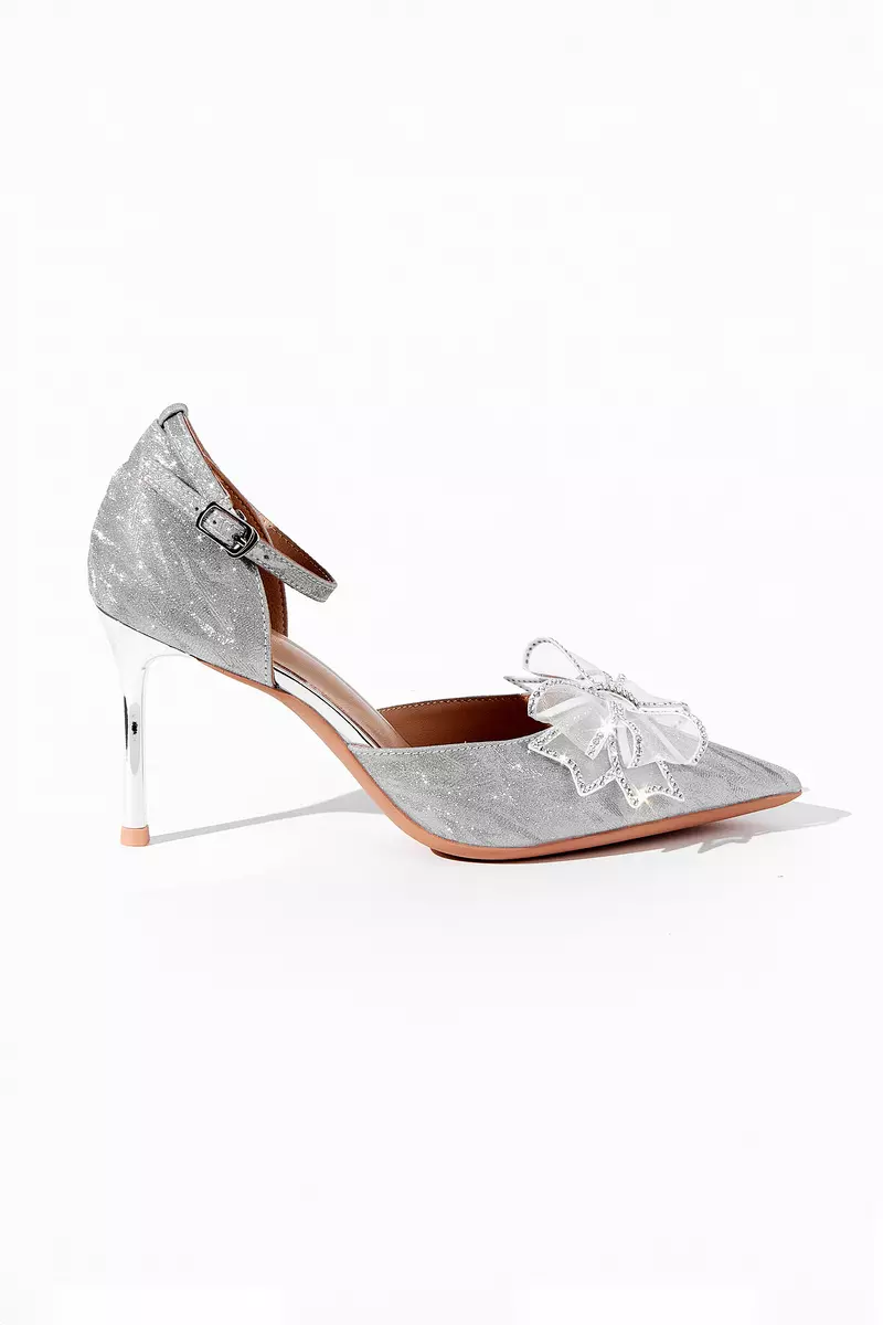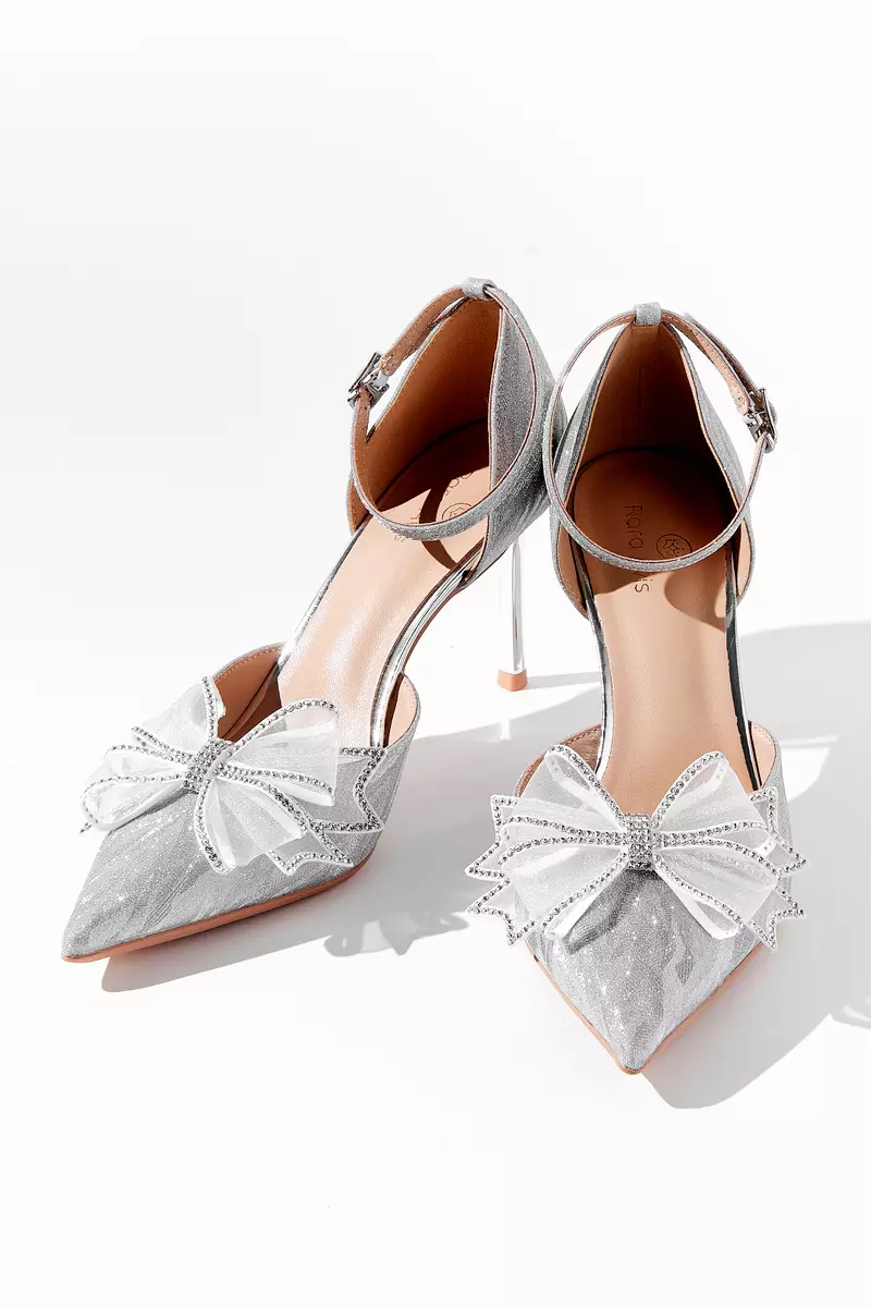 Элегантные полуоткрытые босоножки серебристого цвета. Тонкий ремешок фиксирует ногу, а полупрозрачный бант со стразами придаёт образу особый шарм.