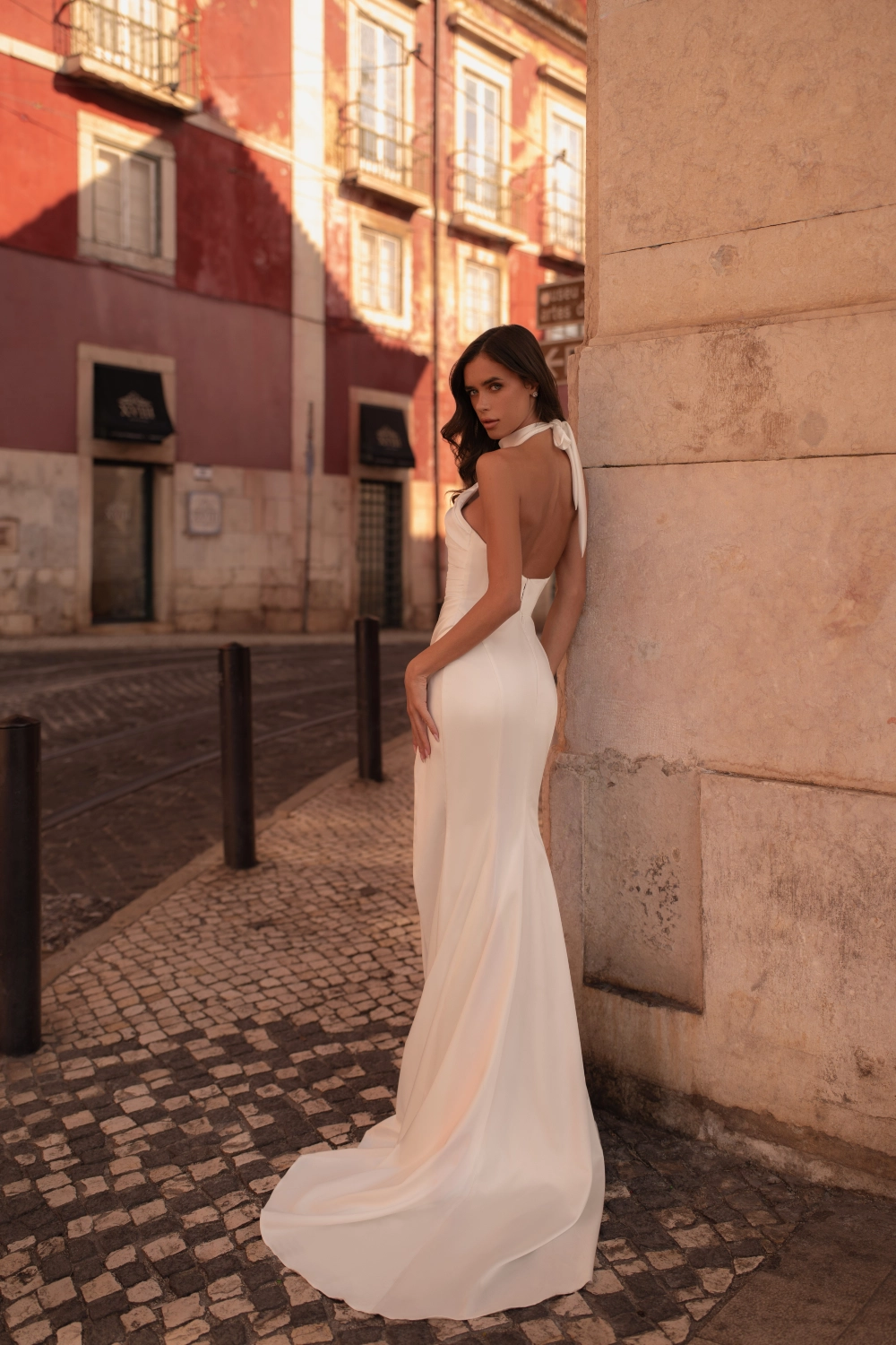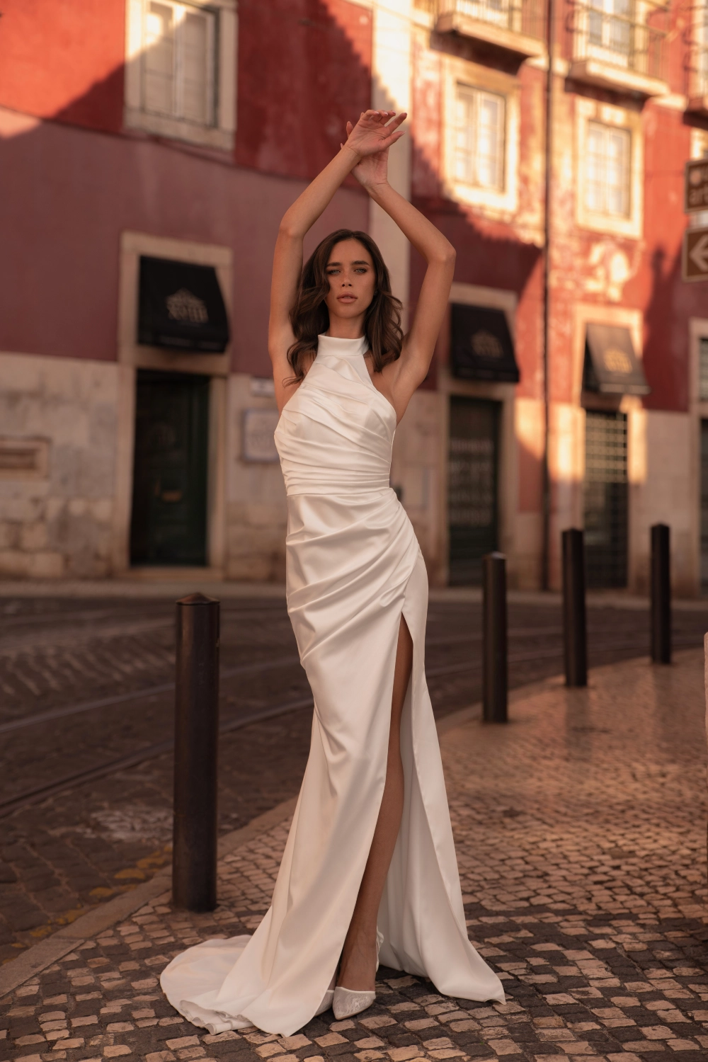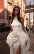 Элегантное свадебное платье силуэта «русалка» с открытой линией плеч и утончённой мягкой стойкой. Рельефный корсет оформлен веерообразными складками, которые плавно переходят в драпировку на талии, создавая ощущение цельного, архитектурного силуэта. Глубокий вырез на спинке подчёркивает изящество образа. Приталенная юбка с выразительным разрезом эффектно акцентирует фигуру. Завершает образ съёмный лёгкий шлейф с мягкой драпировкой и тремя крупными цветами ручной работы, расположенными на поясе.