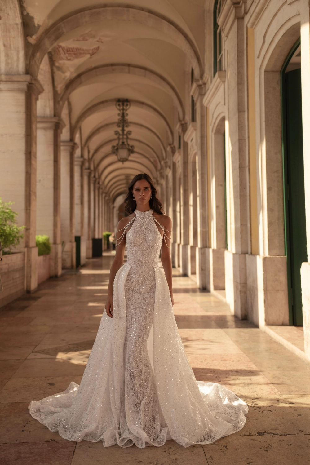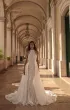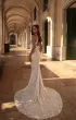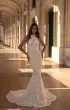 Изысканное свадебное платье силуэта «русалка» с подчёркнутой линией талии, открытыми плечами в американской пройме и элегантным воротником-стойкой. Основа из нежной телесной ткани перекрыта молочным кружевом с тонкой вышивкой, создающим эффект лёгкой дымки. Скульптурный корсет с фигурным подрезом под грудью и декоративными рельефами визуально формирует тонкую талию. Юбка мягко облегает бёдра, расширяется от колен и переходит в роскошный кружевной шлейф. Акцентом служат съёмные украшения на плечах из бусин, бисера и кристаллов, добавляющие сияния и торжественности.