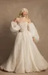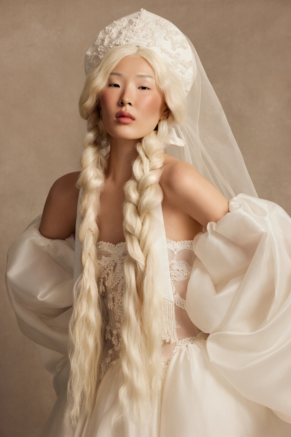 Пышное свадебное платье силуэта «принцесса» с полупрозрачным корсетом и открытой шнуровкой. Декор из жемчуга, ручной вышивки и бисерных кисточек изящно подчёркивает линию груди. Длинная шёлковая юбка со шлейфом выполнена из сливочного шёлка с подкладкой из молочной органзы и объёмным низом. Талию украшает кордовая тесьма. Образ дополняют съёмные объёмные рукава из шёлка. По желанию верхний слой юбки можно заменить на органзу, а корсет выполнить на подкладке.