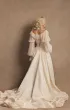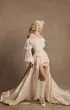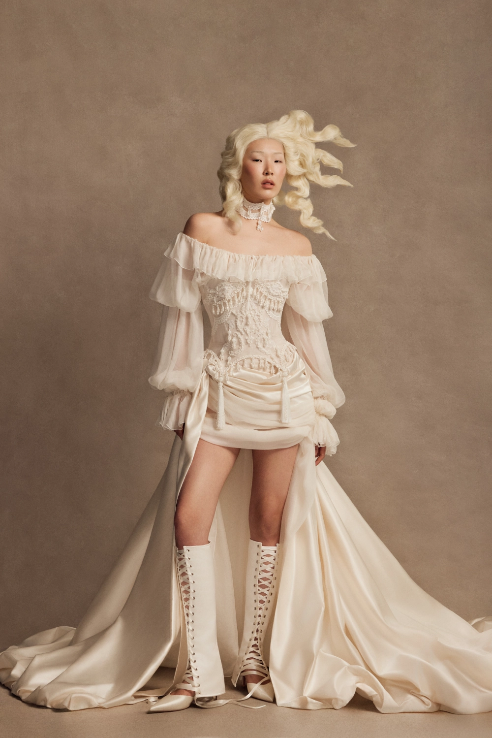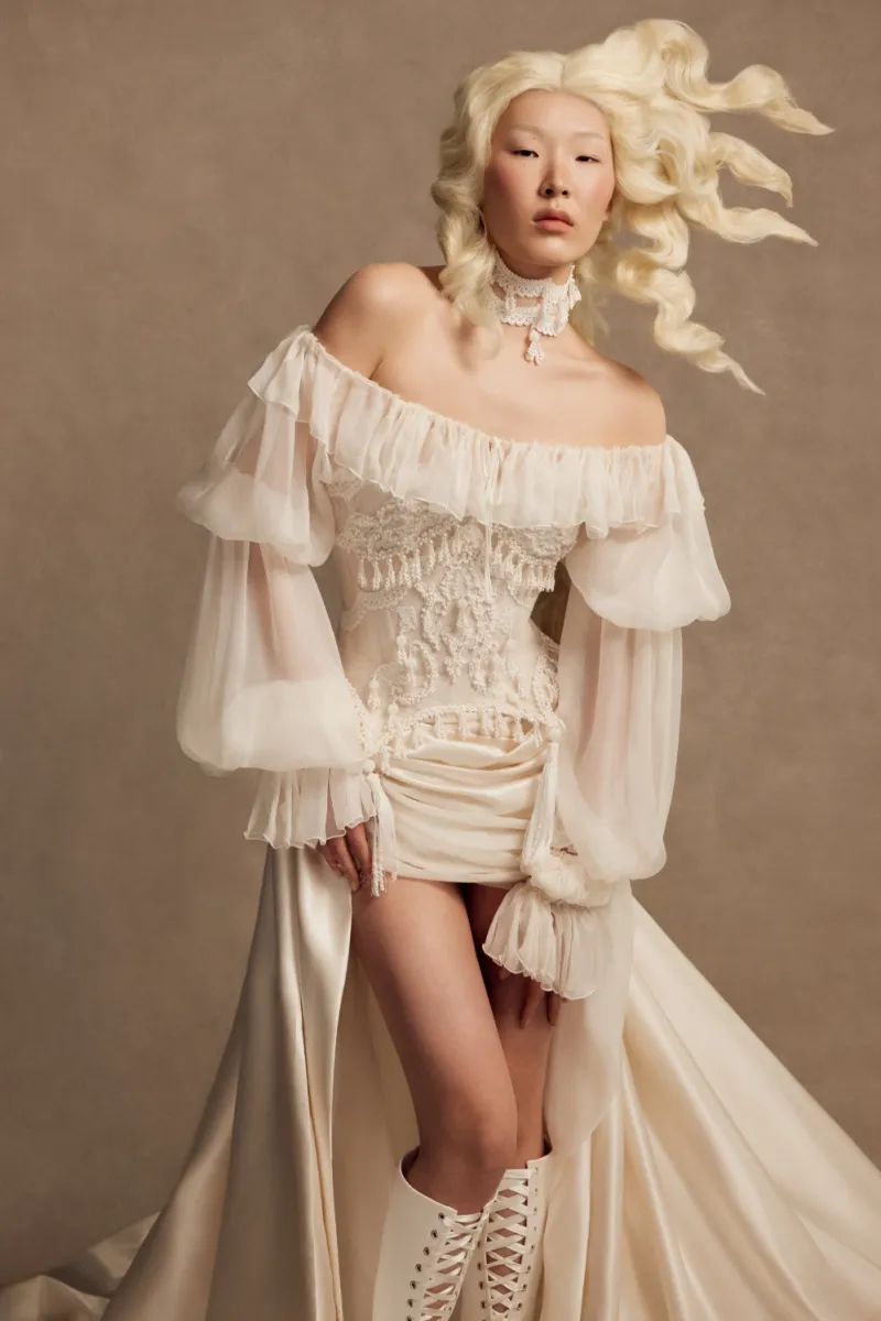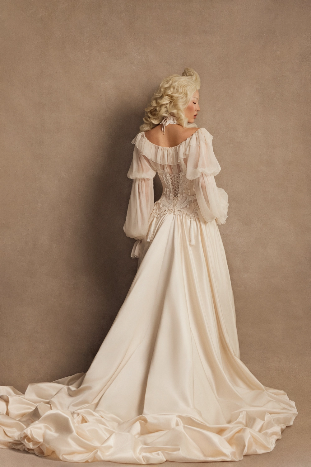 Свадебный комплект, состоящий из корсета, нижнего платья-сорочки, манжет, мини-юбки, съёмного шлейфа и чокера. Полупрозрачный рельефный корсет с открытой шнуровкой украшен кружевной тесьмой, жемчугом, кордовыми элементами и ручными бисерными кисточками. Нижнее платье-сорочка из натурального сливочного шёлка дополнено рукавами-буфами и завязками на горловине. В комплект входят съёмные манжеты с плетёным бисерным декором. Мини-юбка и съёмный шлейф создают выразительный силуэт, а чокер с бисерными кисточками завершает образ.