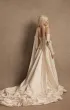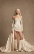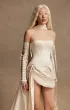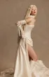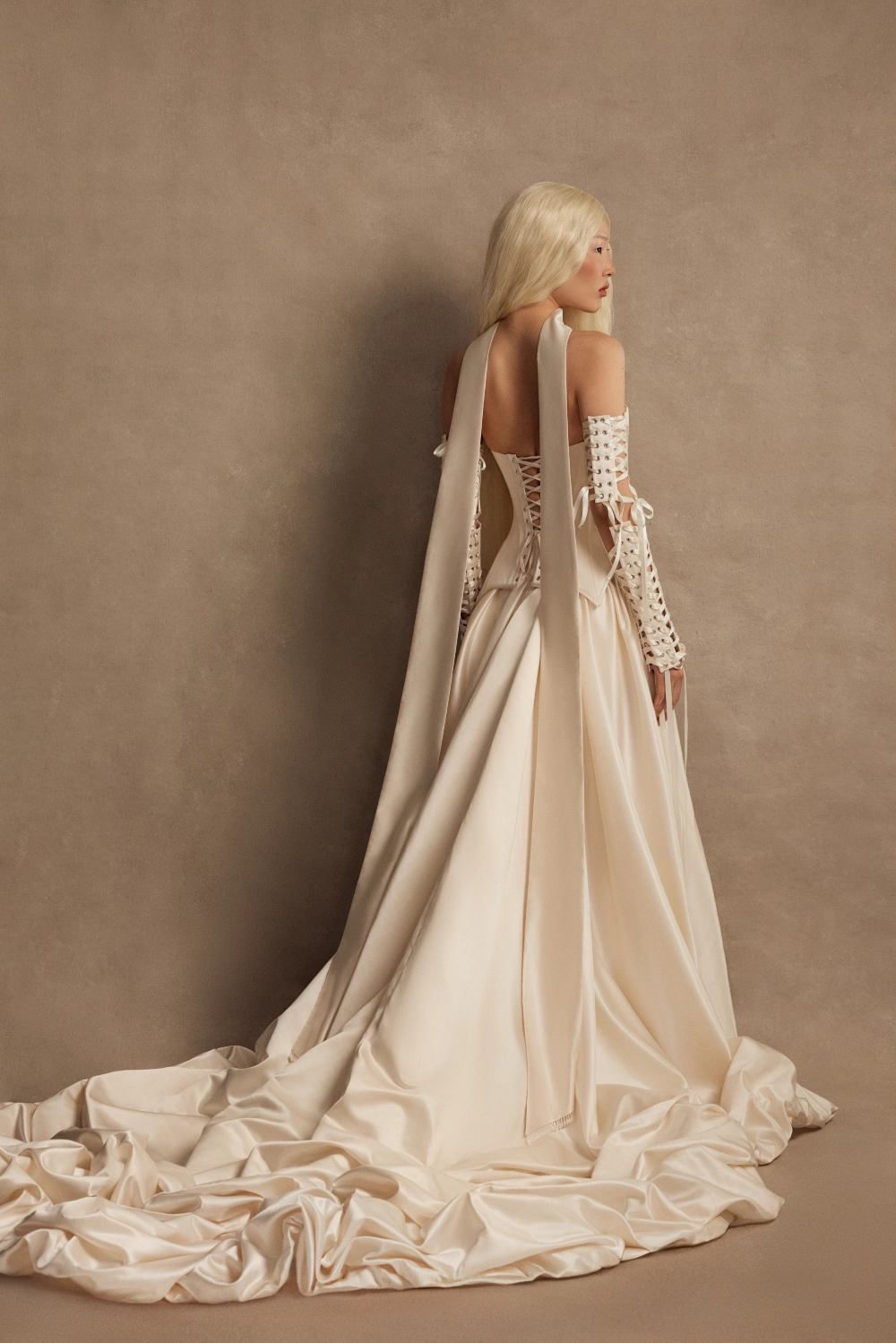 Свадебный комплект из сливочного атласа, включающий корсет, мини-юбку, съёмный шлейф и длинный шарф. Корсет с чёткой рельефной посадкой имеет прямую линию верха, фигурный низ и открытую шнуровку на серебряных люверсах. Мини-юбка выполнена из сеток разной жёсткости и украшена драпировкой из атласа и натурального шёлка в виде банта. Съёмный шлейф со слоями сетки придаёт образу форму и объём, а длинный шарф из атласа украшен изящной бисерной бахромой.