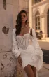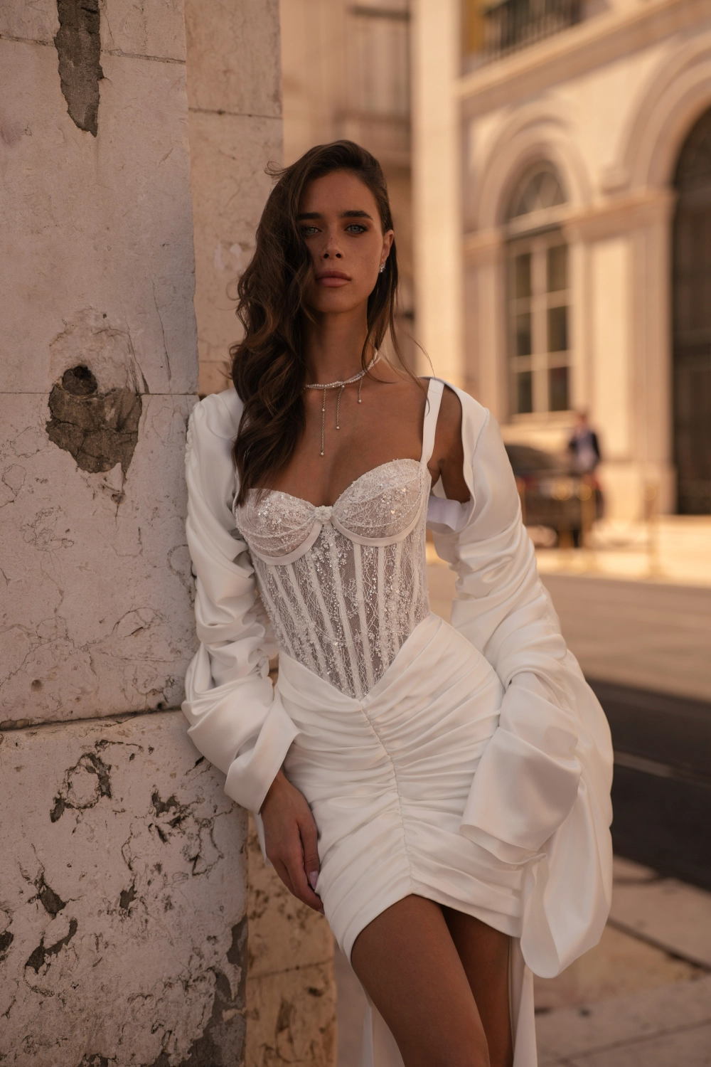 Фантазийное свадебное платье с ярким характером — смелое, но по-настоящему нежное. Роскошный корсет с мягкими миндалевидными чашками задрапирован лёгким шантильи и ажурным кружевом. Фигурная линия талии с изящным мысом подчёркивает силуэт, а рельефы добавляют скульптурности. Центральный акцент — брошь ручной работы с мерцающими нитями из бусин, бисера и кристаллов. Юбка разноуровневая: укороченная спереди для свободы движений и удлинённая сзади, с драпировками и эффектным шлейфом. В комплекте — воздушное болеро с пышными рукавами, усиливающее романтичность образа.