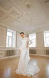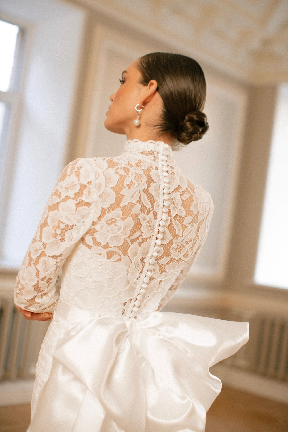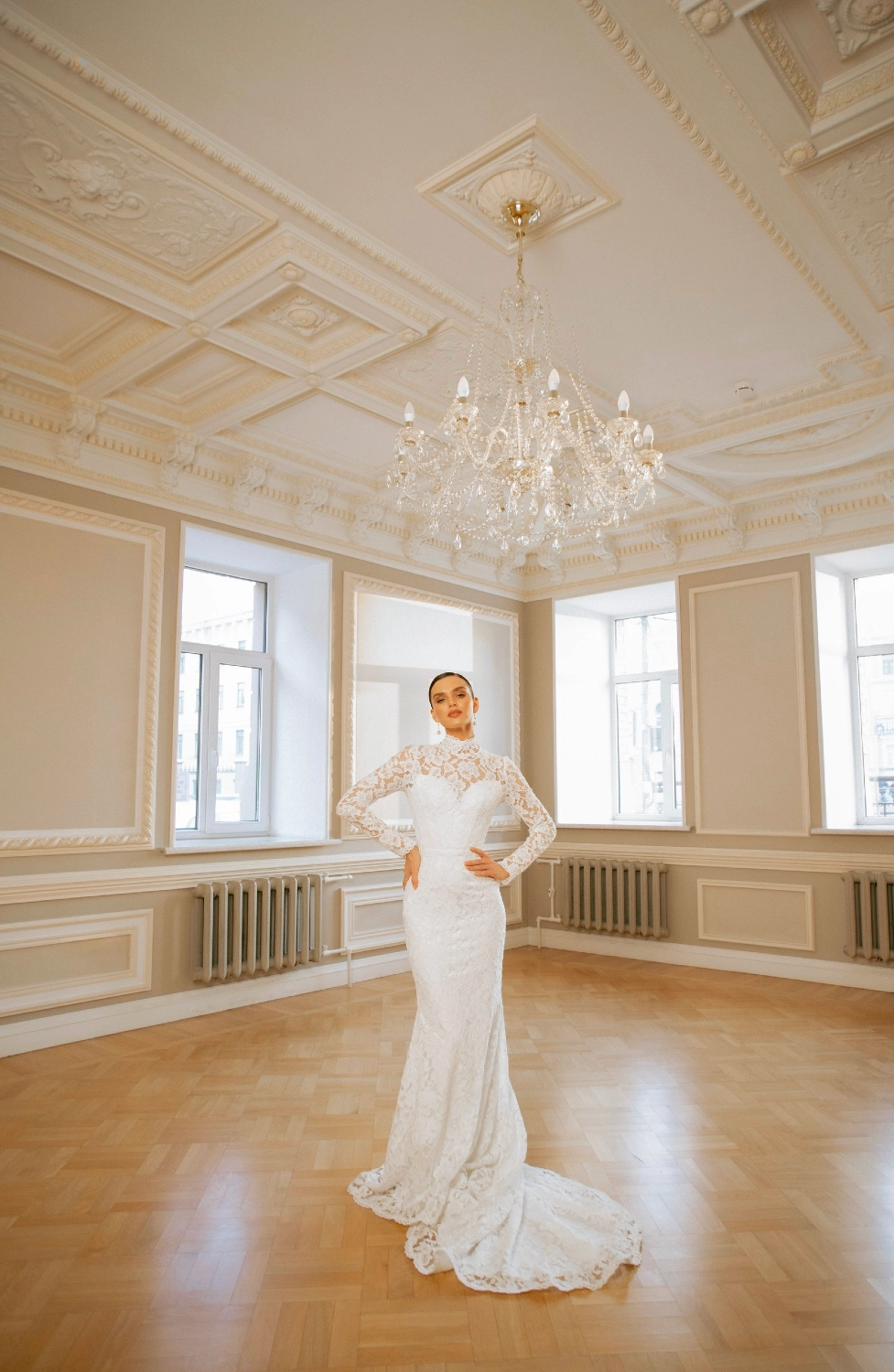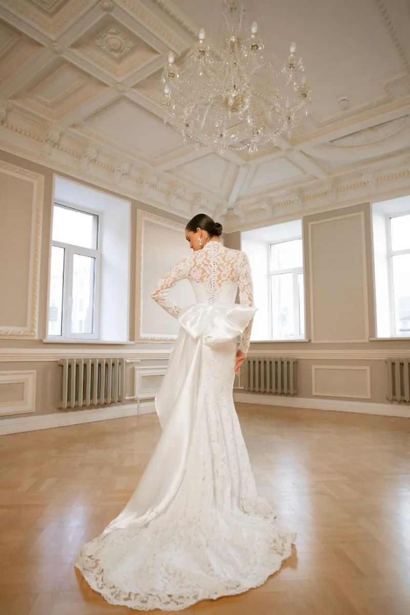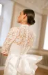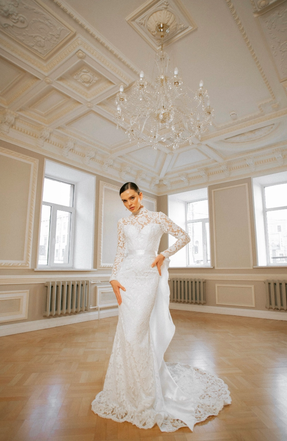 Платье-«русалка» для невесты, ценящей изящество. Корсет с сердцевидным вырезом подчёркивает фигуру и фиксируется шнуровкой на спине. Поверх него надета кружевная майка с узкими рукавами, воротником-стойкой и фестонами, которая придаёт образу утончённость. Юбка мягко расширяется от колен и завершается длинным шлейфом. Клинья и подрезы создают лёгкое движение ткани, а кружевная отделка по краю завершает силуэт. Дополняет модель съёмный пояс с объёмным асимметричным бантом из атласа.