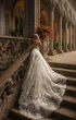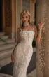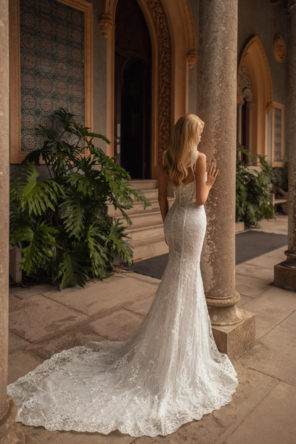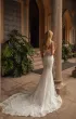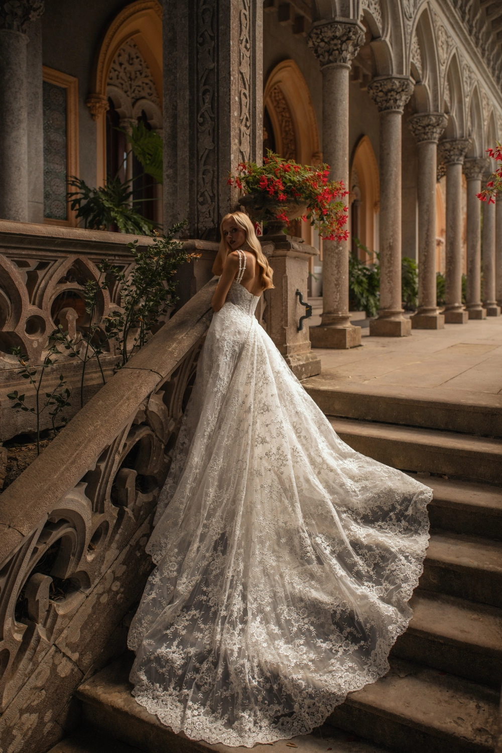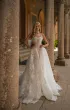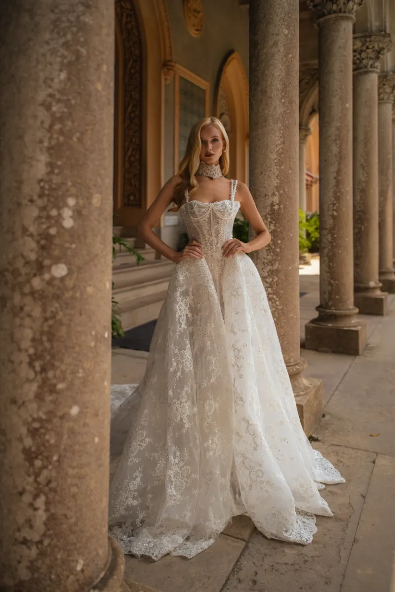 Свадебный комплект «русалка» с полупрозрачным корсетом, украшенным жемчугом, стразами и бисером. Юбка из многослойной сетки и кружева со шлейфом дополнена пудровыми шортами. Платье трансформируется съёмной юбкой из сетки «соты» и кружева с пайетками, а также чокером, расшитым стразами. Возможные изменения: молочная или пудровая подкладка, кружевные крылышки.