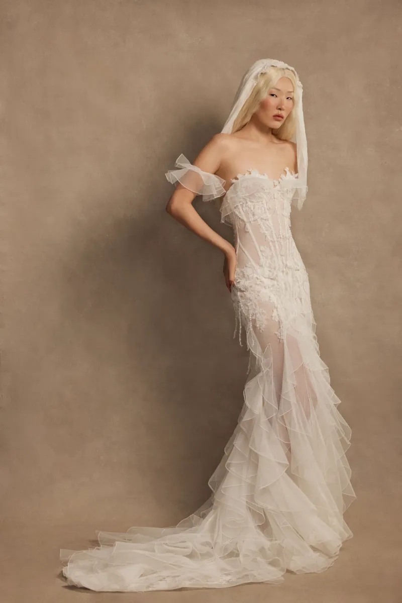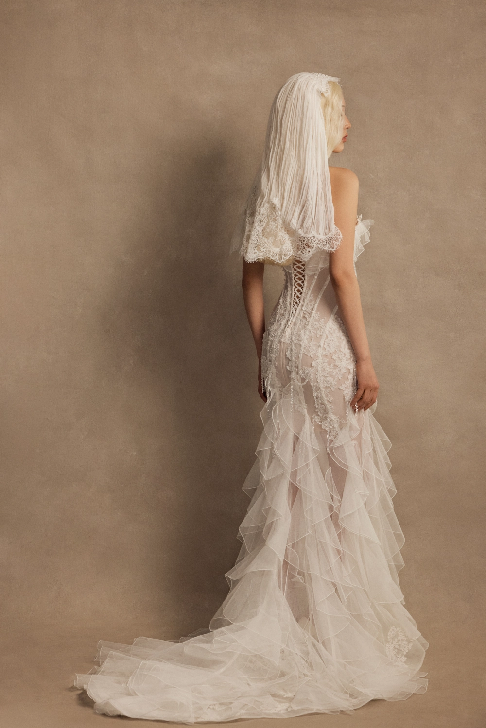 Свадебное платье силуэта «рыбка» с удлинённым полупрозрачным корсетом и мягкими чашками. Корсет украшен бархатной шнуровкой и декоративными тоннелями с молочным кружевом.
