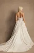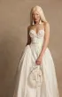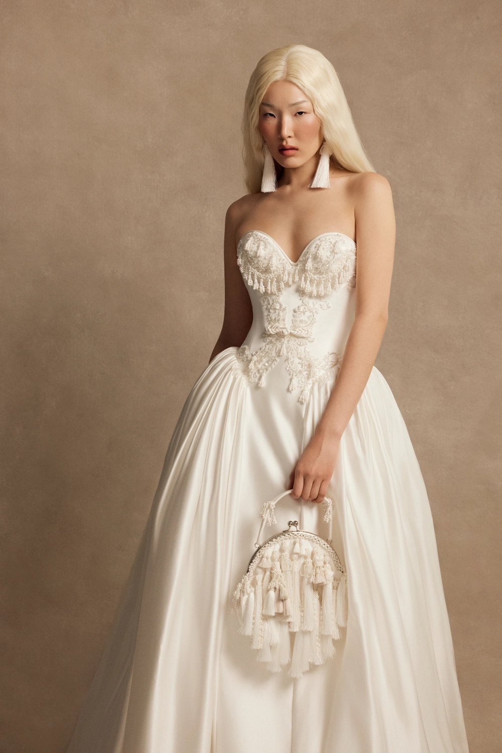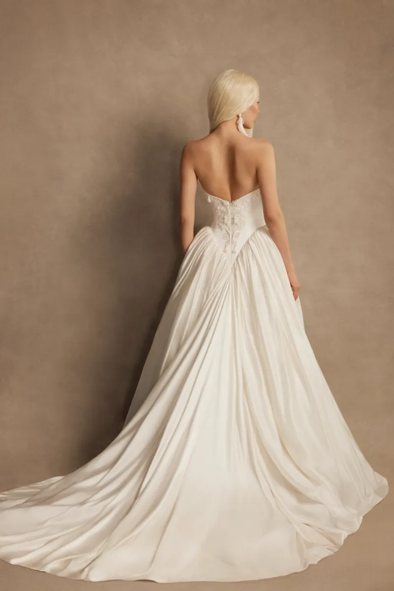 Пышное свадебное платье силуэта «принцесса» с рельефным корсетом из натурального шёлка и объёмной длинной юбкой. Корсет с фирменными чашками и внутренней шнуровкой дополнен молнией и металлическими косточками. Декор включает шёлковый шнур, декоративный пояс, серебряный бисер, пайетки, жемчуг и плетёные кисточки.