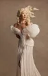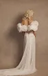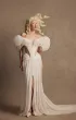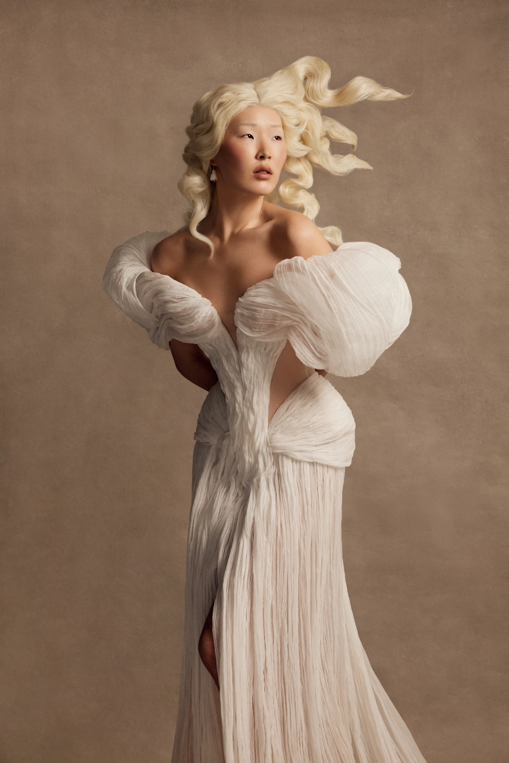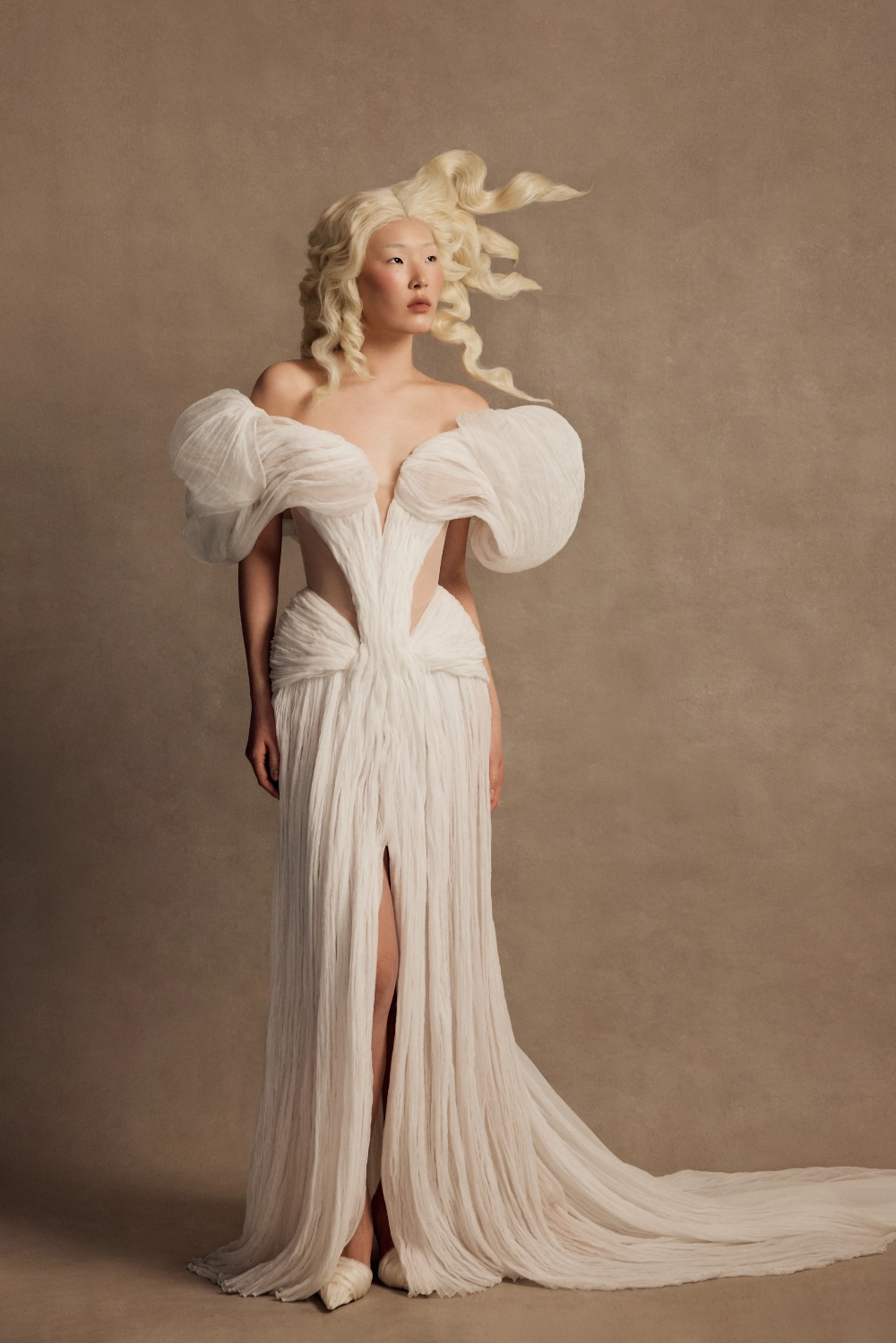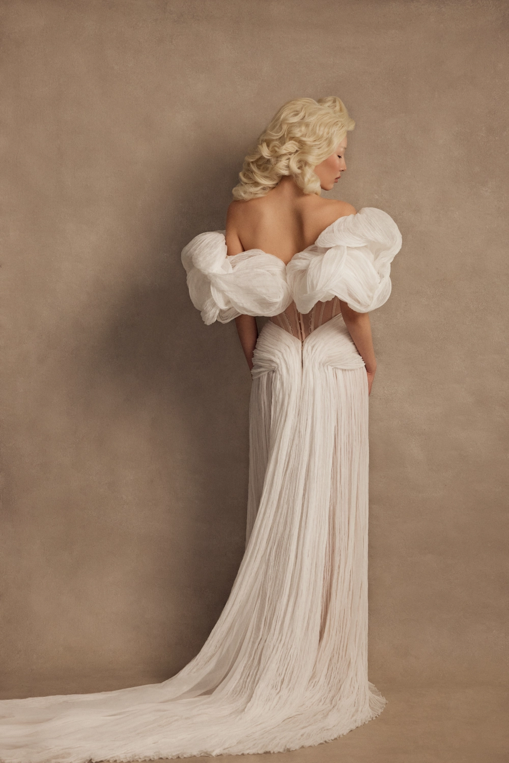 Лёгкое свадебное платье А-силуэта с разрезом спереди и полупрозрачным рельефным корсетом. Корсет с внутренней шнуровкой и застёжкой на крючки дополнен каркасными плечиками с шёлковой драпировкой, плавно переходящей на юбку. Основа юбки выполнена из сетки без шлейфа, с боковыми каркасными элементами для объёма. Верхний слой — натуральный шёлк с мягкой драпировкой и клином из необработанного шёлка. Образ выглядит воздушным и современным.