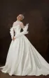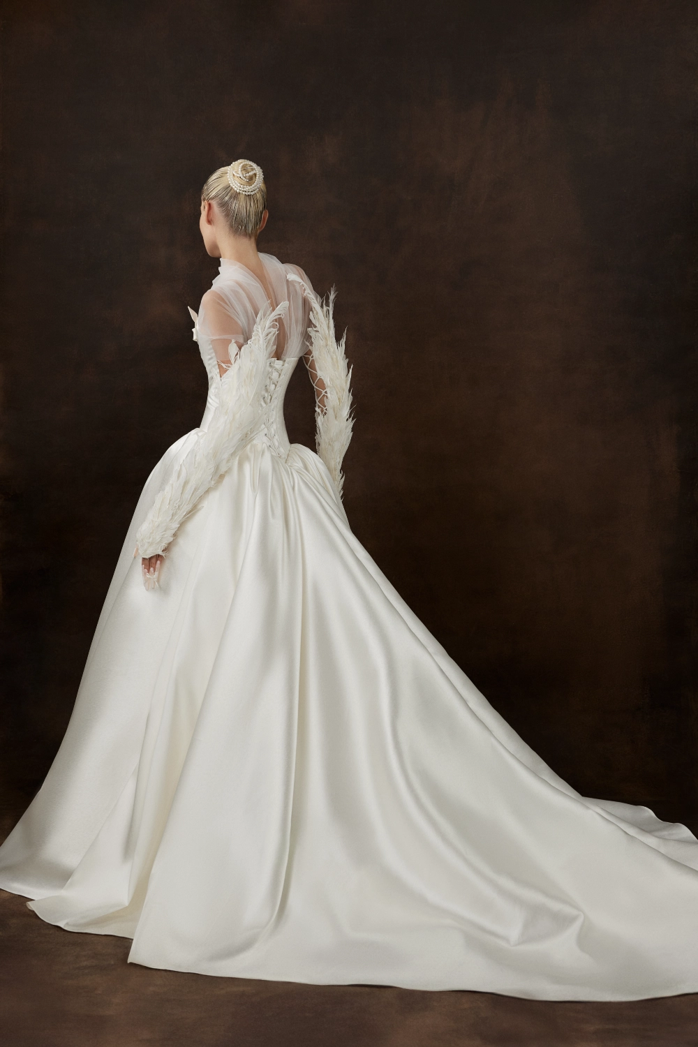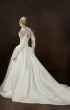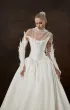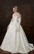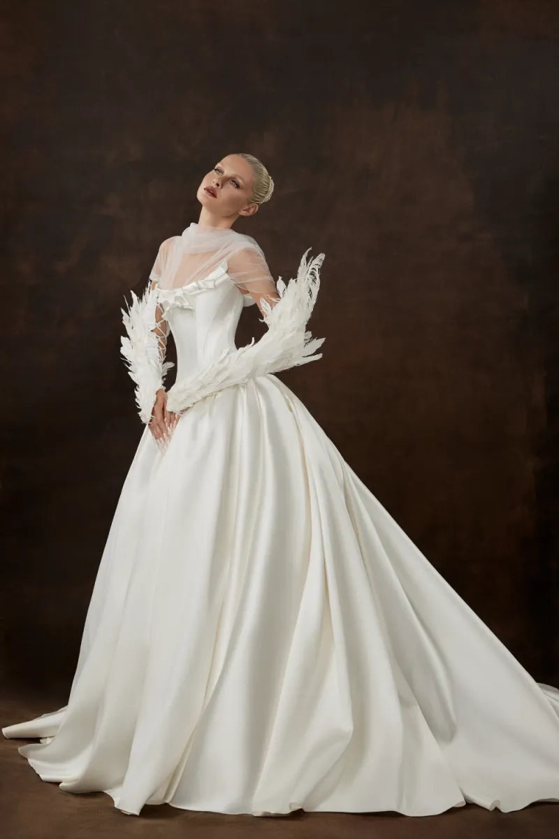Пышное свадебное платье в эстетике классической принцессы. Корсет с рельефами и декоративными строчками дополнен открытой спинкой со шнуровкой, а спереди акцентирован крупным объёмным бантом. Юбка с мягкой сборкой, струящимся шлейфом и скрытыми карманами делает образ не только эффектным, но и функциональным. В комплект входит болеро.