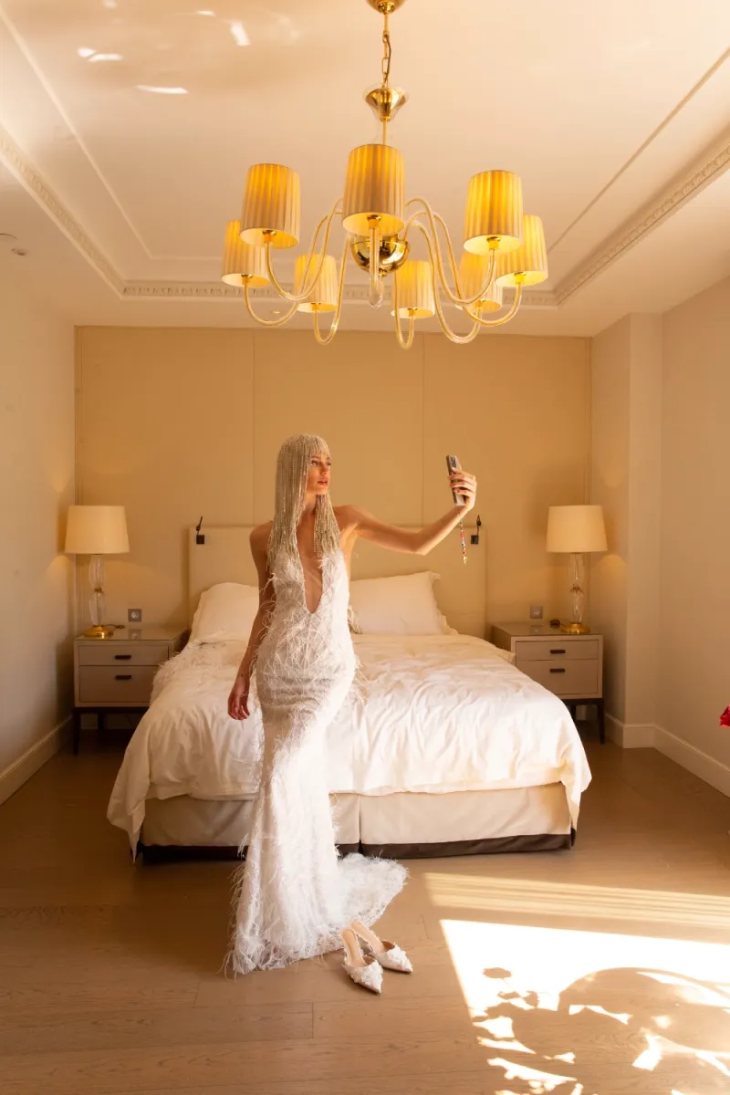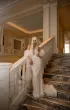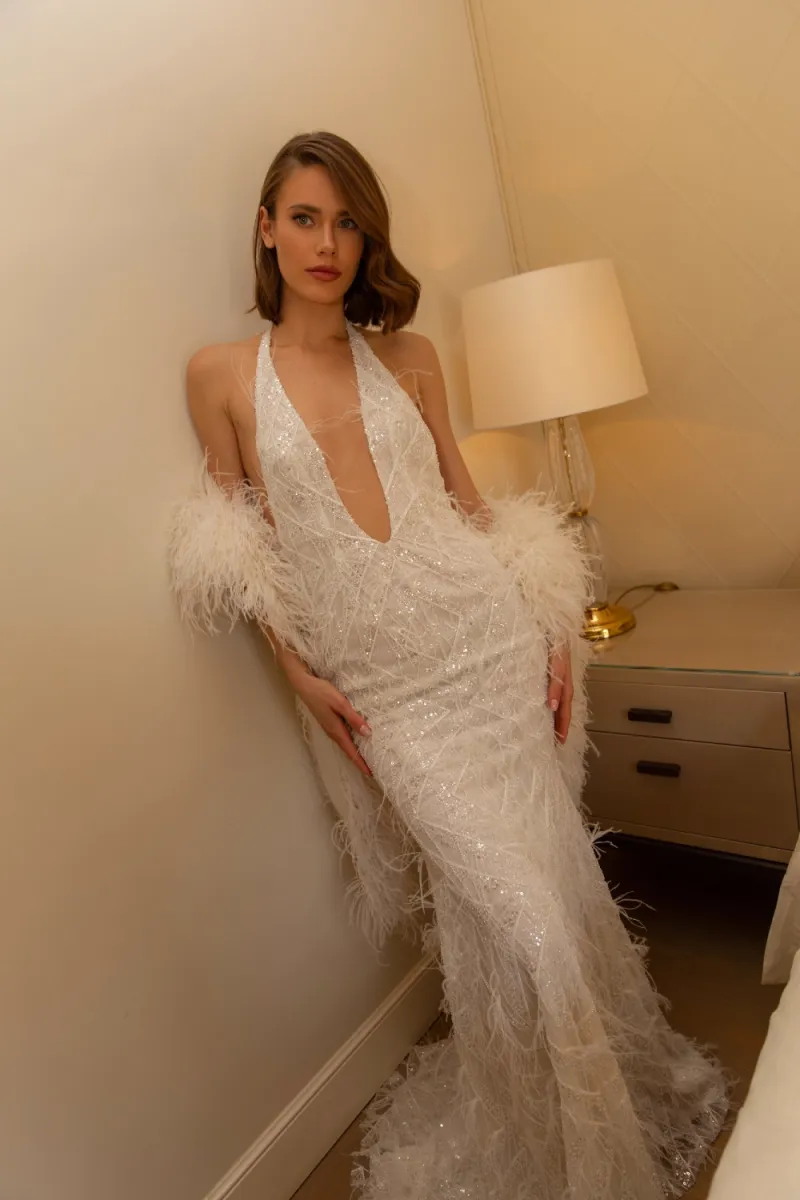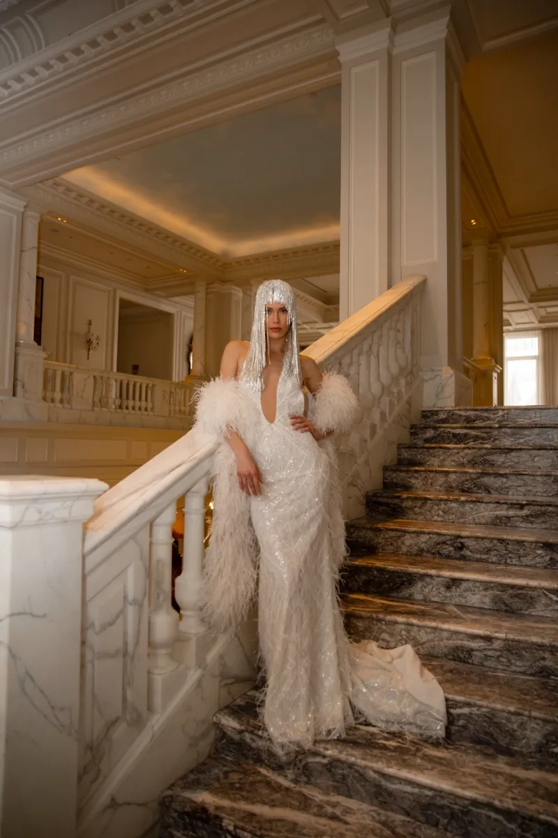 Платье «рыбка» с глубоким U-образным вырезом на сетке цвета «пудра» и удлинённым шлейфом. Лиф фиксируется на шее крючками и пуговицей, спинка — на потайную молнию. Под кружевным декором скрывается серебристое шантильи, создающее сияние. Юбка на подкладке из полупрозрачного шифона оттенка «молоко» с деликатной обработкой низа и открытым краем кружева.