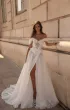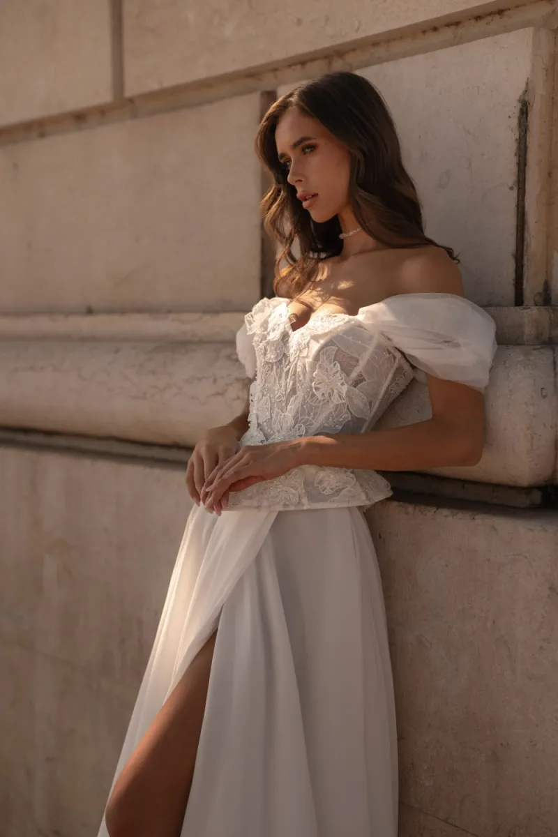 Свадебный комплект из выразительного корсета и юбки силуэта «рыбка». Корсет идентичен первой версии: скульптурный, украшенный кружевом шантильи, пайетками и объёмными цветами, с декольте в форме сердца и акцентной баской. Юбка облегает фигуру на телесной основе, покрыта двумя видами роскошного кружева, расширяется клиньями от колен и завершается аккуратным шлейфом. Образ дополняется съёмными бретелями и лёгким декоративным шарфом.