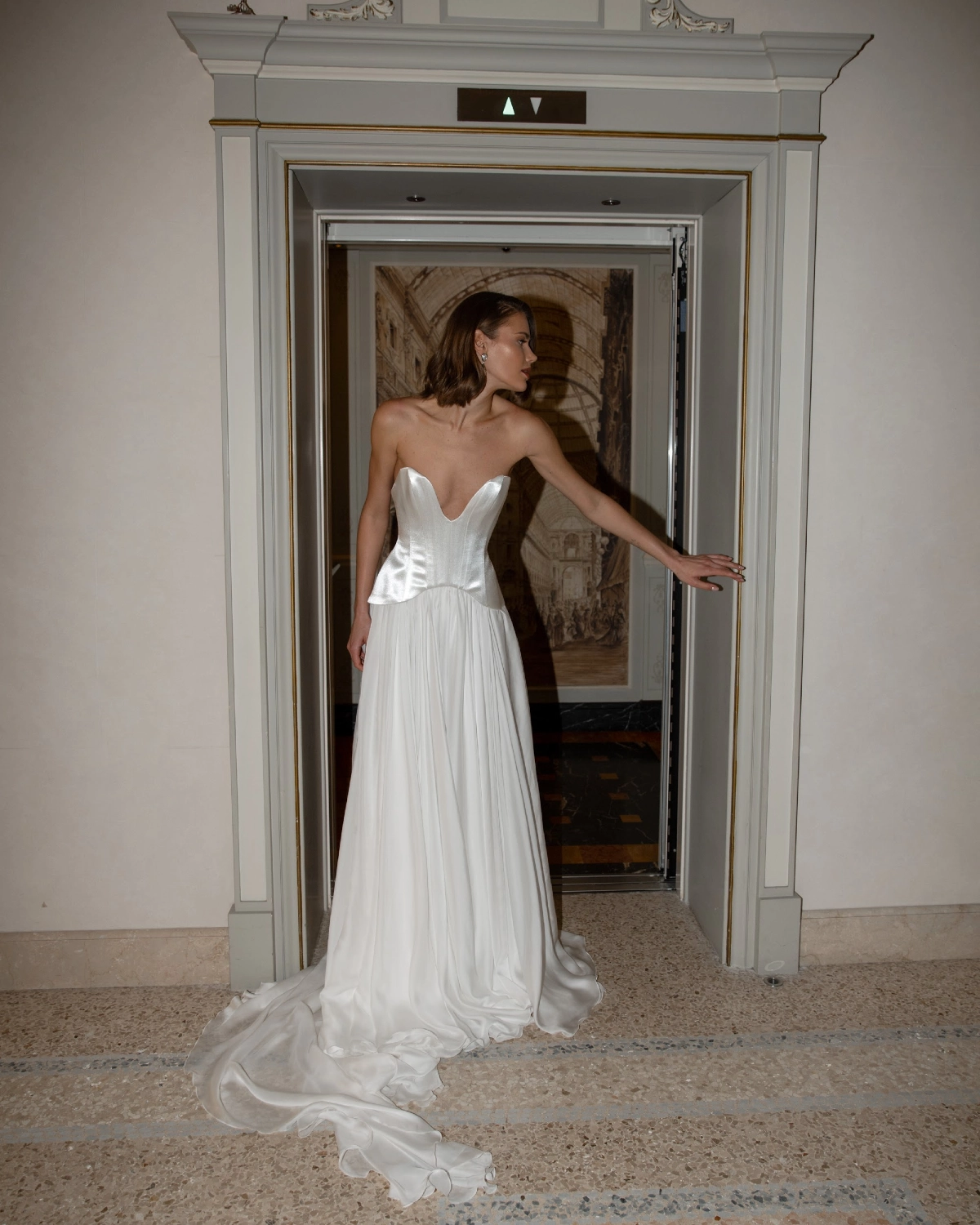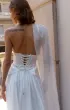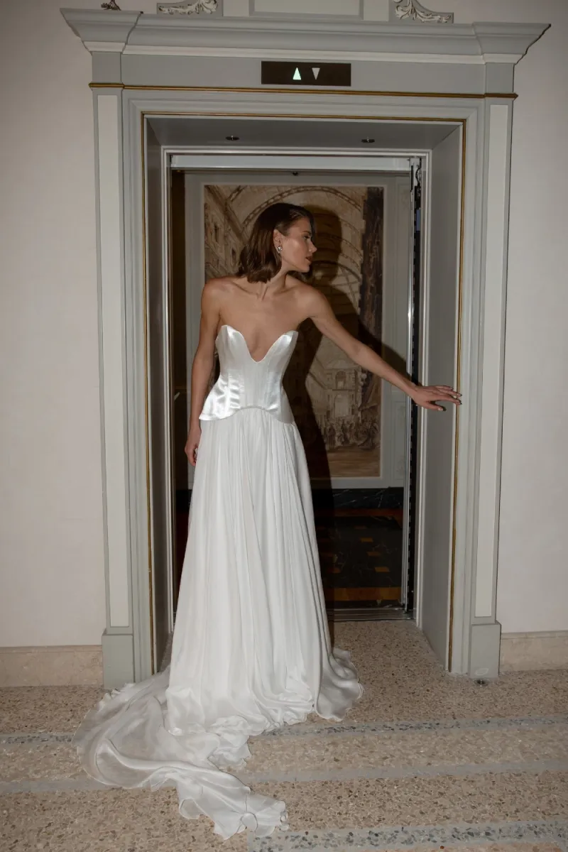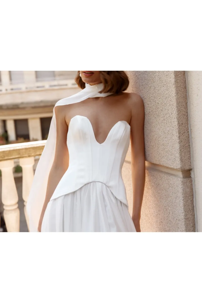 Современный свадебный комплект прямого силуэта: корсет и юбка со шлейфом. Корсет с U-образным декольте и фигурным низом застёгивается на шнуровку. Юбка конического кроя украшена атласным поясом с декоративной застёжкой. Подкладка выполнена из стрейч-бархата цвета «молоко», низ обработан закруткой. В комплект не входит воздушный шифоновый шарф. Возможны разные варианты длины юбки и формы выреза.