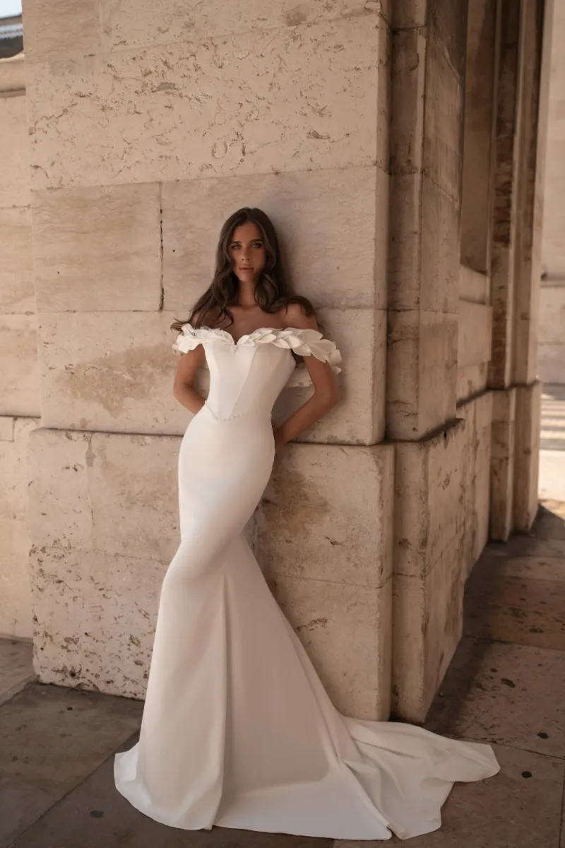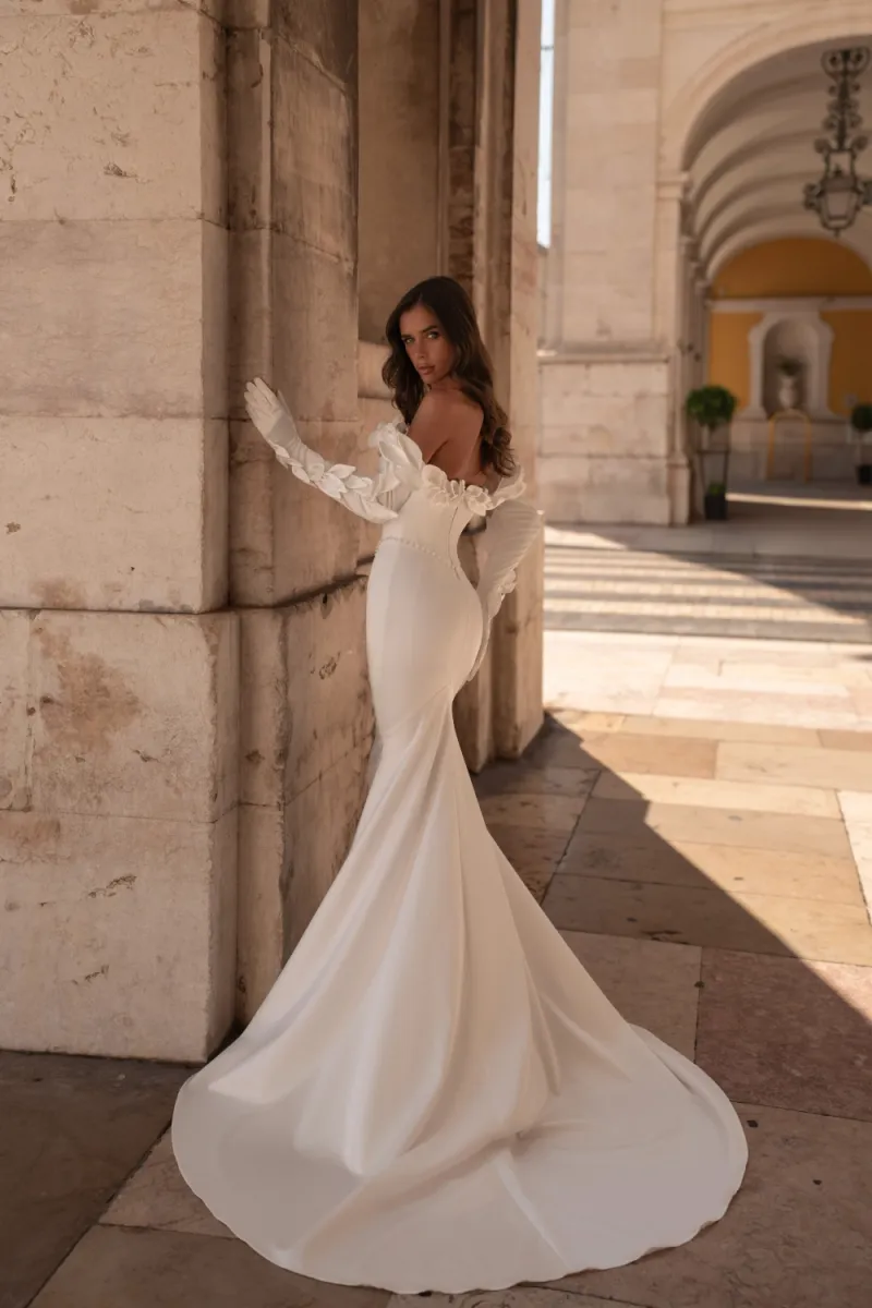 Свадебное платье силуэта «русалка» из молочного сатина с благородным матовым блеском. Корсет с выразительным декольте и широкими бретелями украшен объёмным декором из лепестков и сияющей россыпью бусин. Пояс ручной работы подчёркивает талию и добавляет нарядности. Юбка плотно облегает фигуру, плавно расклешается от колен и переходит в элегантный шлейф.