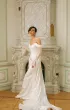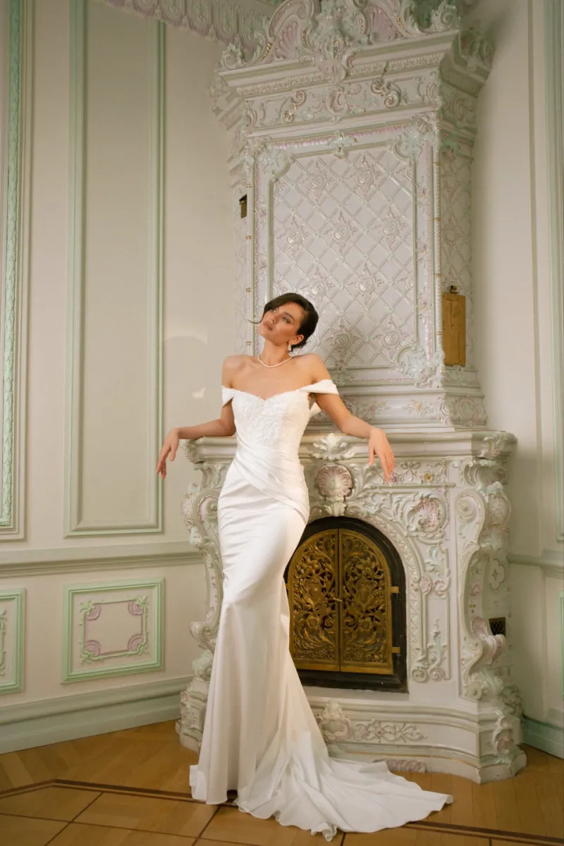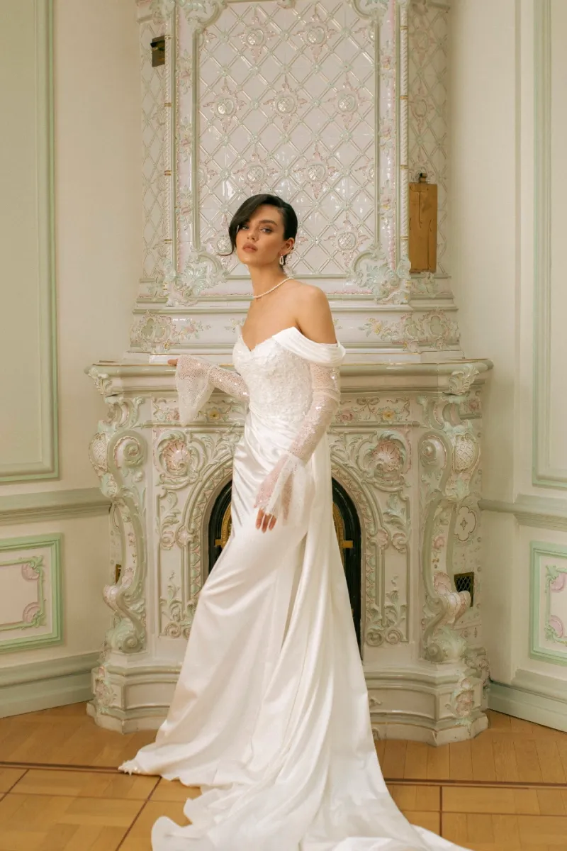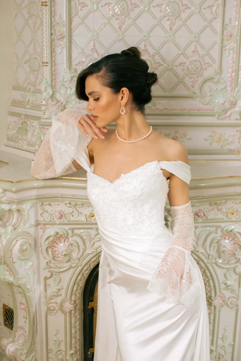 Трансформируемый свадебный комплект из корсета, юбки и съёмного шлейфа. Матовый атласный корсет украшен фантазийной драпировкой из органзы Monalisa и фиксируется шнуровкой с металлическими люверсами. Юбка облегает бёдра и от колен раскрывается в шлейф. Драпировка и глубокий разрез придают динамику и современный характер. Съёмный шлейф из органзы крепится на крючки, создавая эффект лёгкости. Возможны изменения глубины или положения разреза, а также вариант юбки без него.