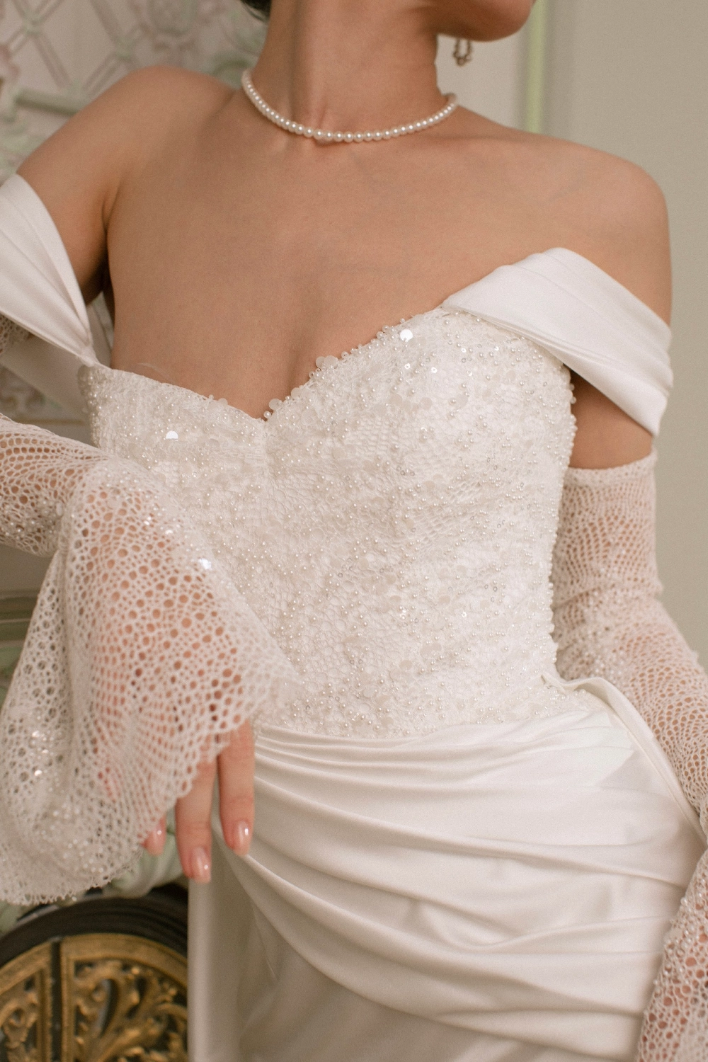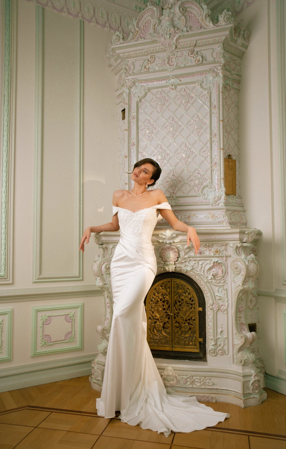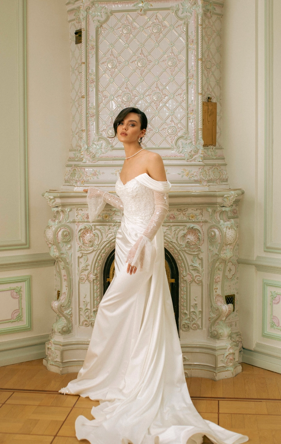 Трансформируемый свадебный комплект из корсета, юбки и съёмного шлейфа. Матовый атласный корсет украшен фантазийной драпировкой из органзы Monalisa и фиксируется шнуровкой с металлическими люверсами. Юбка облегает бёдра и от колен раскрывается в шлейф. Драпировка и глубокий разрез придают динамику и современный характер. Съёмный шлейф из органзы крепится на крючки, создавая эффект лёгкости. Возможны изменения глубины или положения разреза, а также вариант юбки без него.