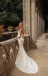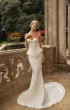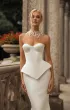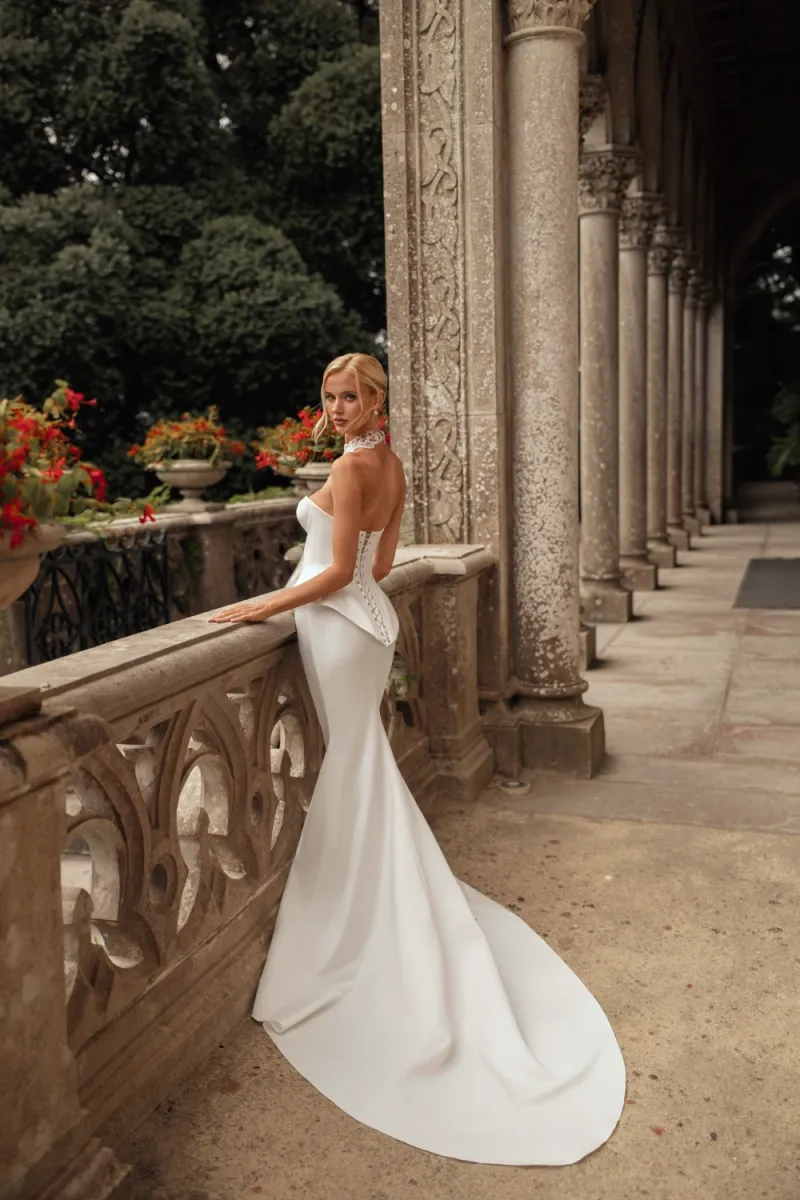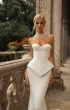 Свадебный комплект с удлинённым корсетом и юбкой А-силуэта. Корсет с плотными чашками и баской украшен бисером, жемчугом и бусинами, открытая шнуровка на спинке добавляет элегантности. Юбка из атласа со шлейфом и разрезом на левой ноге с слоями фатина и сетки создаёт лёгкий и торжественный силуэт. Пояс фиксируется шнуровкой. Возможные изменения: внутренняя шнуровка, корсет без декора, съёмные крылышки, замена ткани на микадо лимонного оттенка.