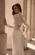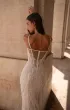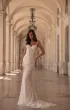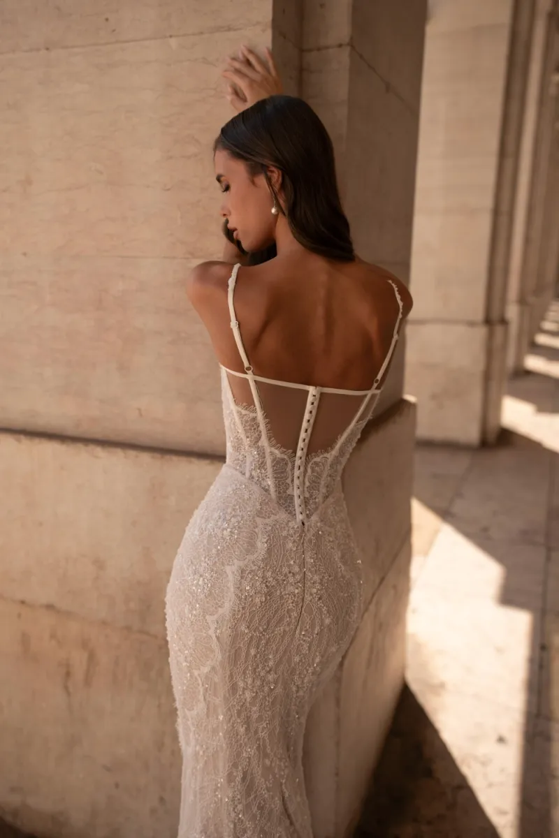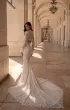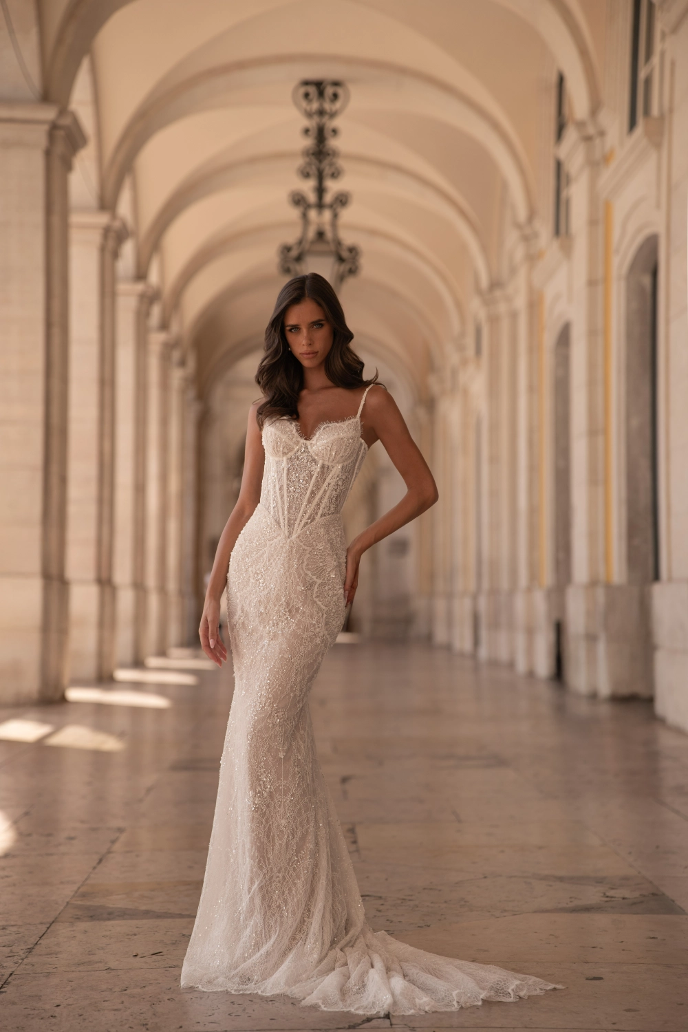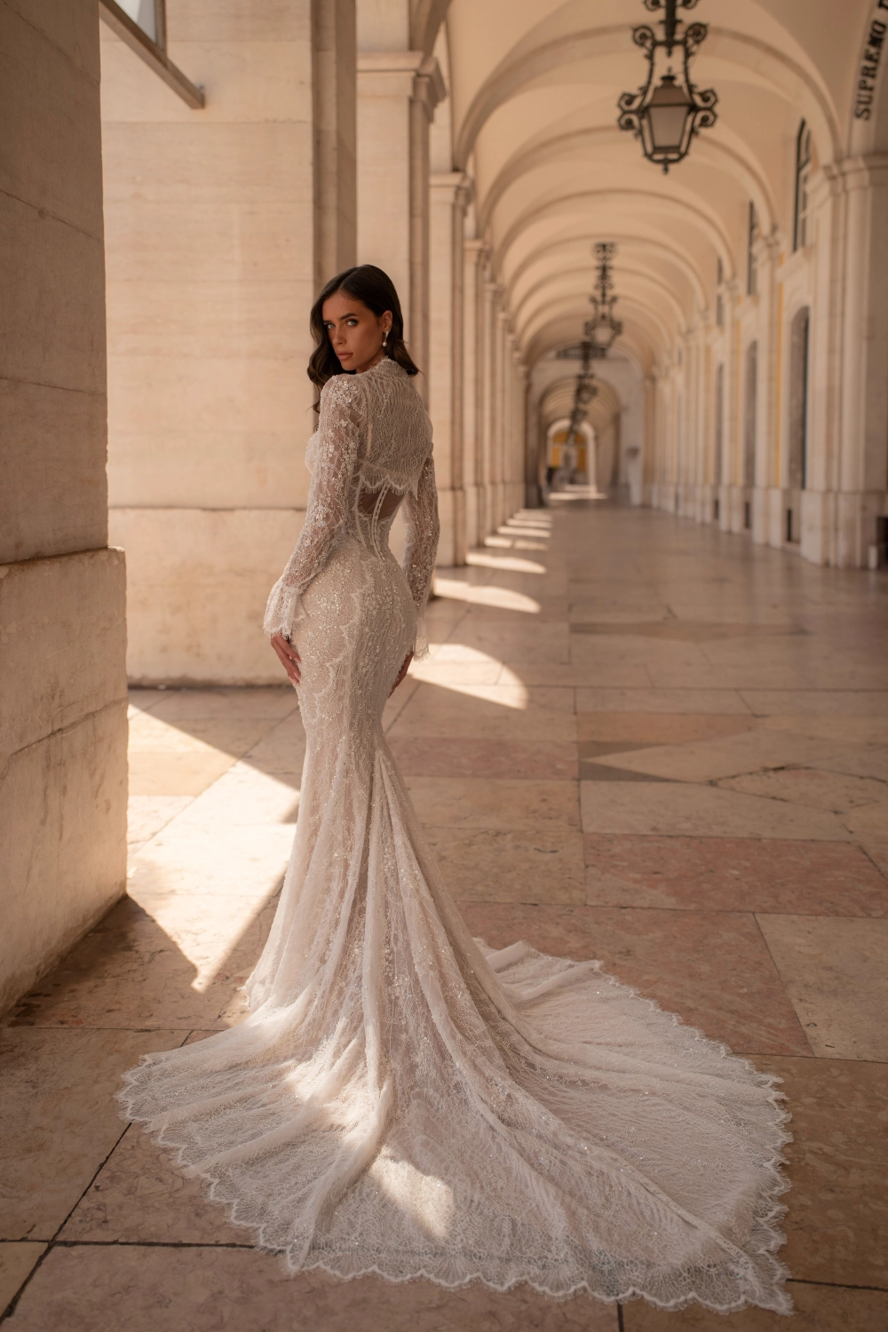 Соблазнительное платье силуэта «рыбка» с полупрозрачным корсетом, расшитым шантильи, пайетками и ажурным кружевом. Многослойная юбка сочетает сверкающее кружево и эластичный атлас, дополнена диагональными кокетками и утончёнными фестонами, визуально вытягивающими силуэт. Длинный шлейф завершает образ. В комплекте — воздушное болеро и съёмная брошь с изящными подвесами.