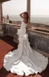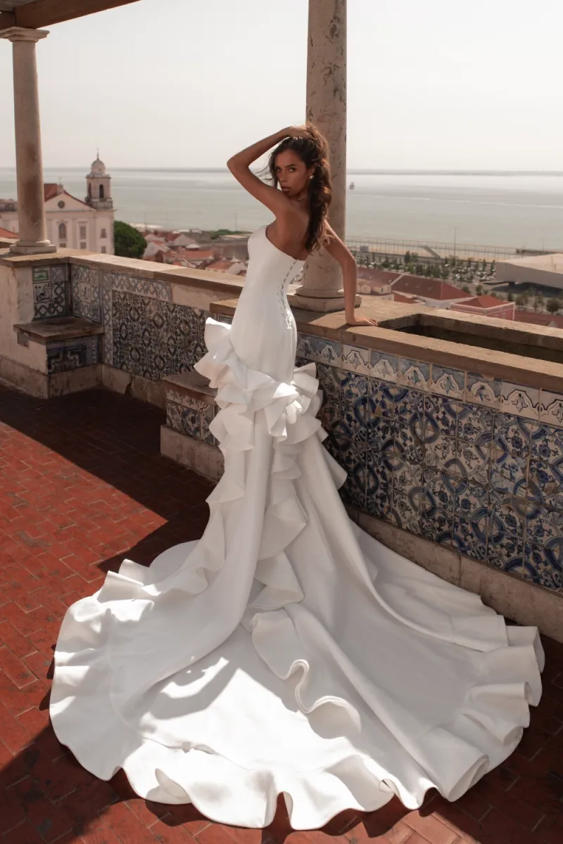 Фантазийное свадебное платье с выразительным характером и романтичной пластикой. Удлинённый корсет из эластичного сатина и шантильи украшен фигурными деталями, декольте в форме сердца и шнуровкой на спинке. Воланы с мягкими складками по нижнему краю добавляют лёгкости. Грациозный шлейф с рельефами и воланами завершает силуэт, создавая ощущение движения и воздушности.