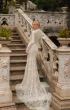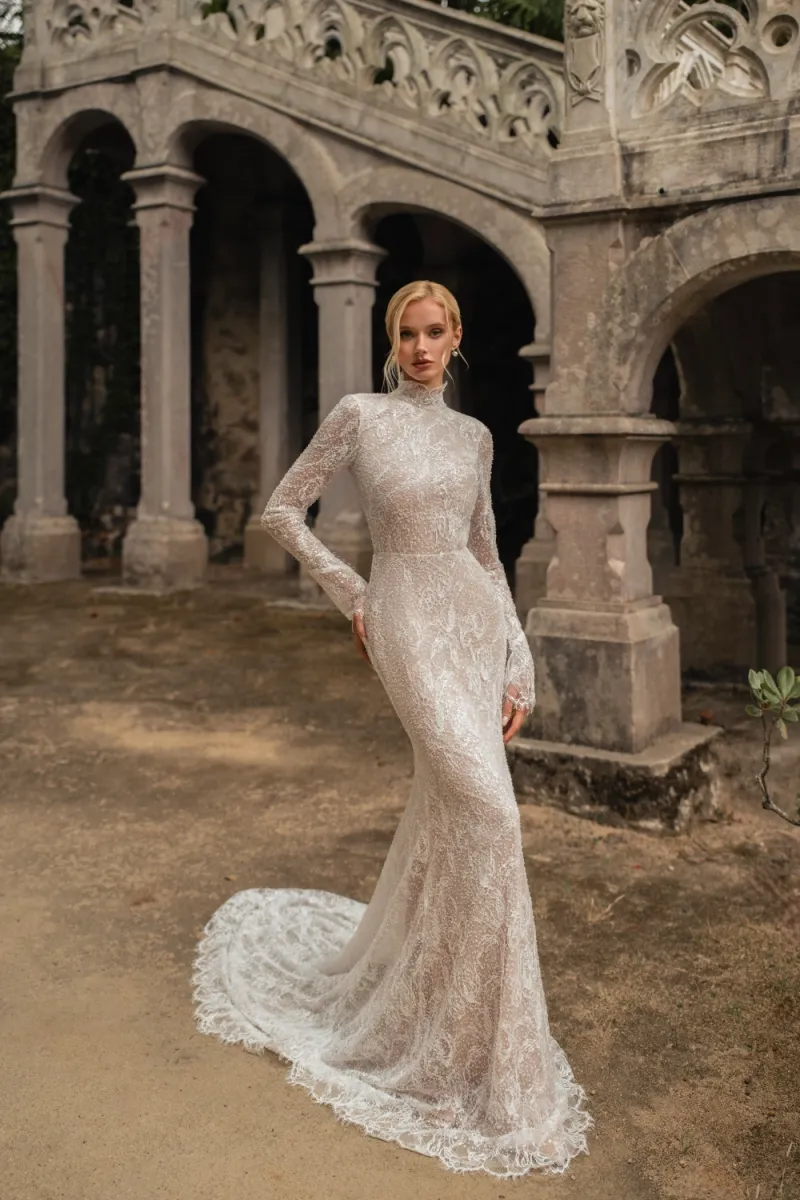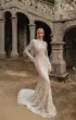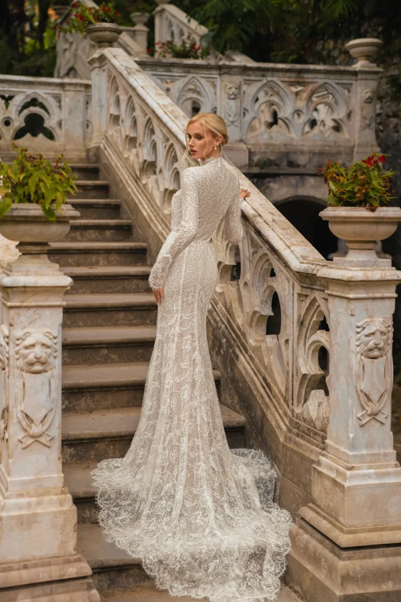 Свадебное платье силуэта «русалка» в закрытом исполнении. Лаконичная майка с длинными узкими рукавами и воротником-стойкой выполнена из пудрового крепа и молочной сетки, дополнена застёжкой на молнии и пуговицы по спинке. Расклёшенные к низу рукава украшены изящными разрезами с прозрачными пуговицами. Юбка-«рыбка» на пудровой подкладке подчёркивает фигуру и завершается длинным шлейфом. Рельефные линии создают безупречный силуэт, соединяя строгость и элегантность. Возможные изменения: исполнение на молочной подкладке.