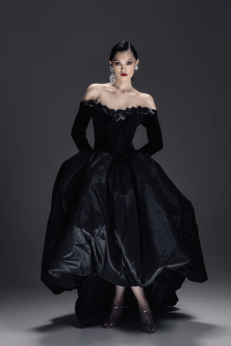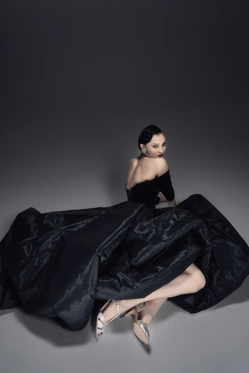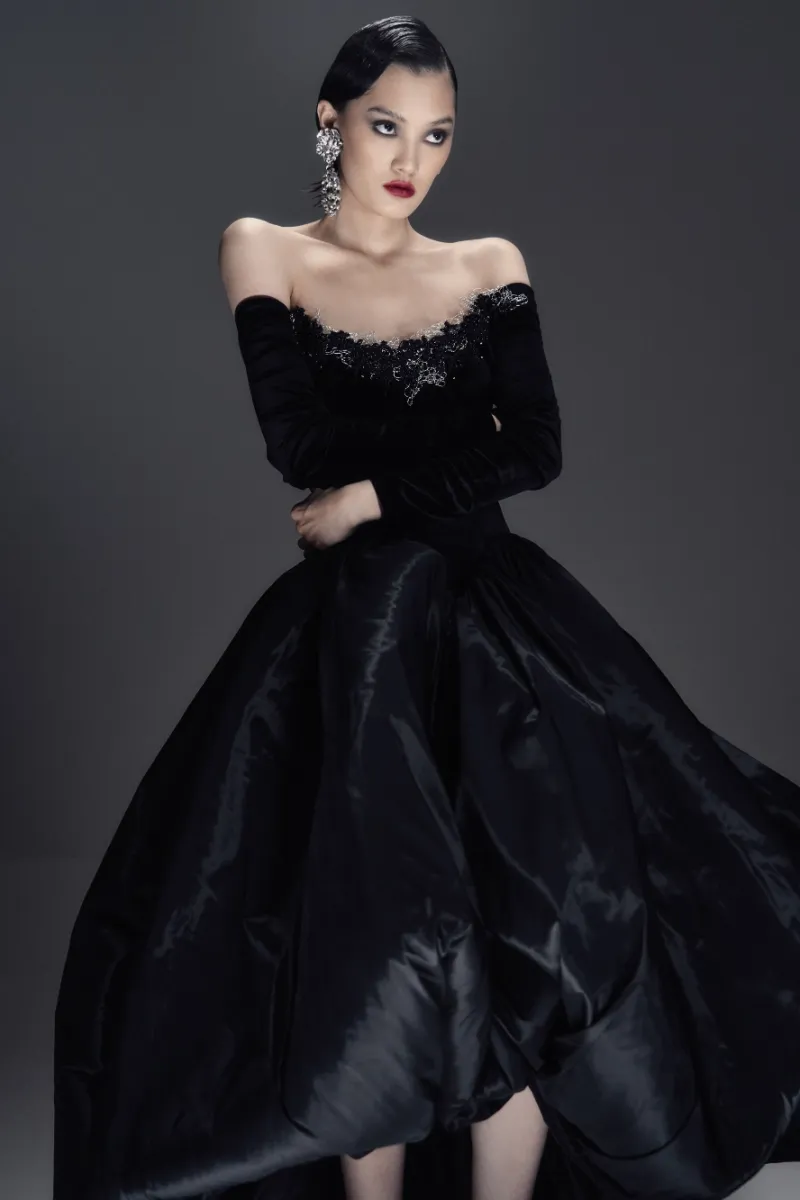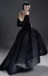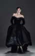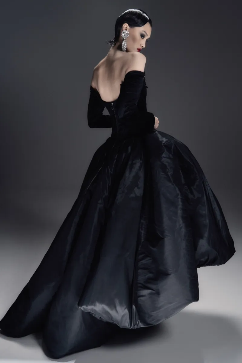 Элегантное бархатное платье-миди А-силуэта с изысканным атласным шлейфом. Корсетный лиф с рельефной формой и острыми архитектурными линиями украшен тонким кружевом, кристаллами и металлическим ажуром холодного блеска. Длинные бархатные рукава на потайных молниях создают утончённый акцент. Воздушная юбка-баллон дополнена скрытыми удобными карманами. По центру спинки — эффектная серебристая молния, добавляющая образу характер и дерзость.