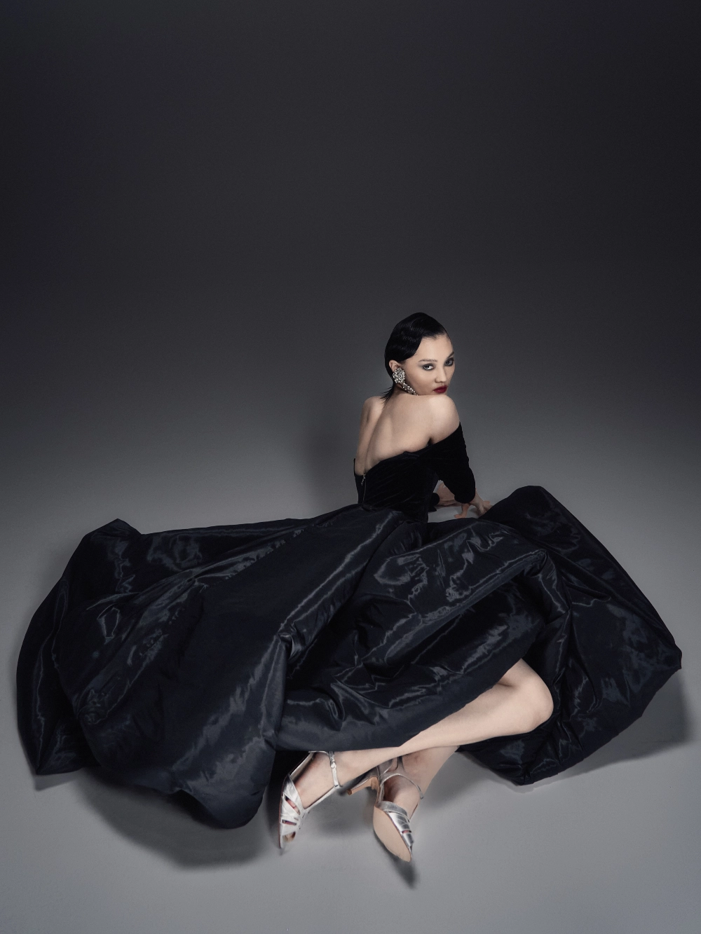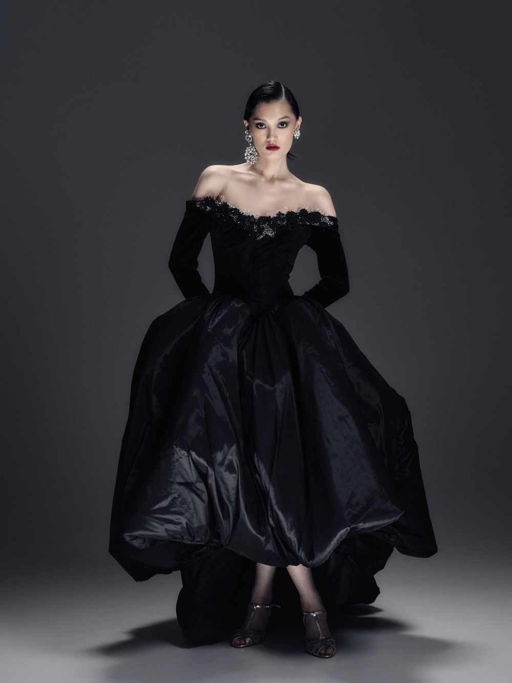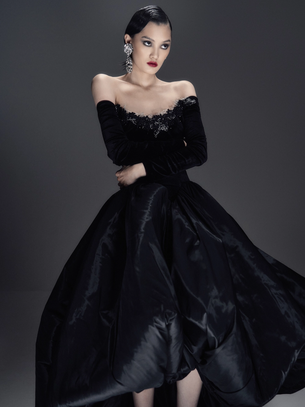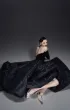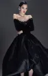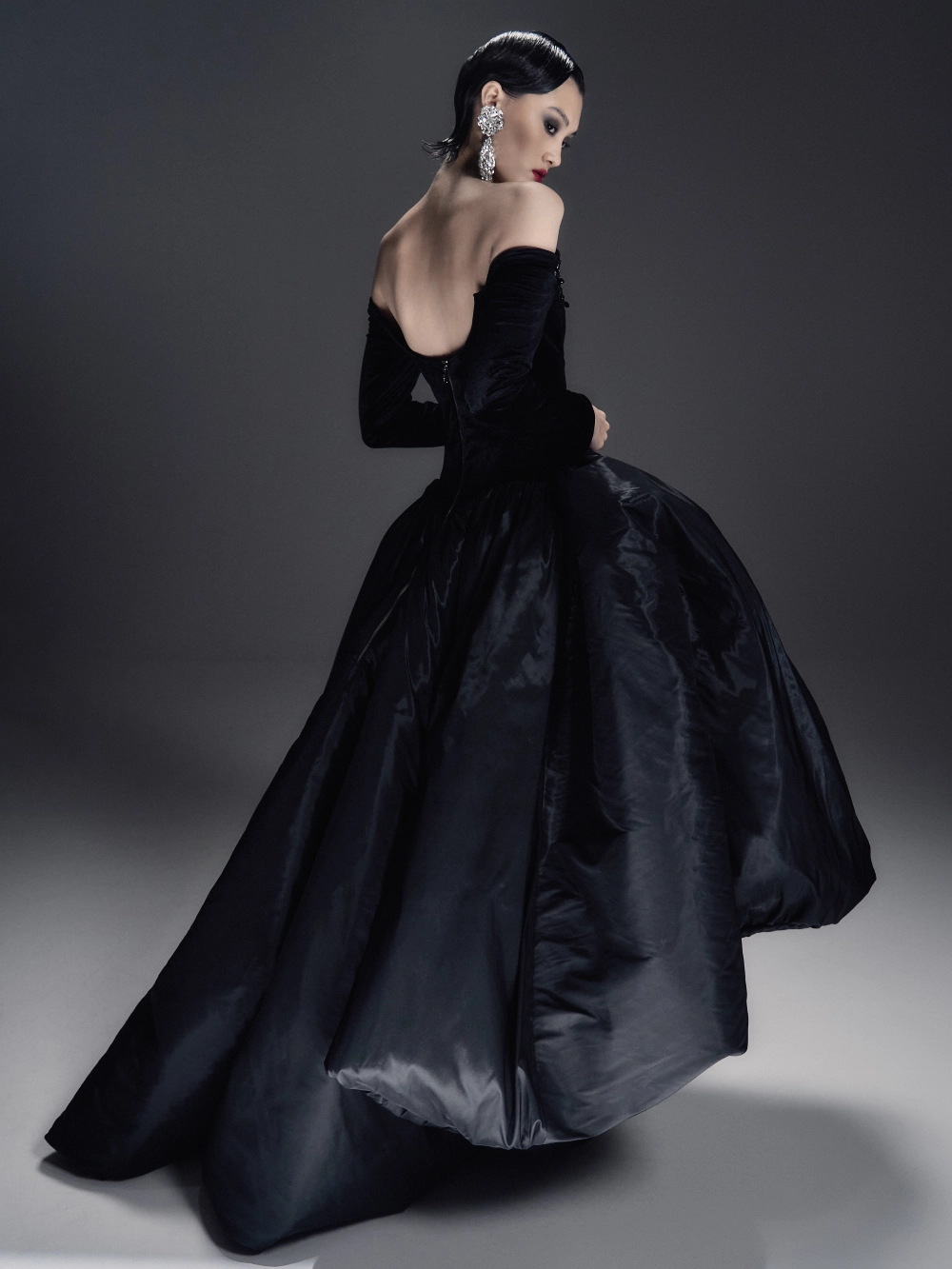 Элегантное бархатное платье-миди А-силуэта с изысканным атласным шлейфом. Корсетный лиф с рельефной формой и острыми архитектурными линиями украшен тонким кружевом, кристаллами и металлическим ажуром холодного блеска. Длинные бархатные рукава на потайных молниях создают утончённый акцент. Воздушная юбка-баллон дополнена скрытыми удобными карманами. По центру спинки — эффектная серебристая молния, добавляющая образу характер и дерзость.