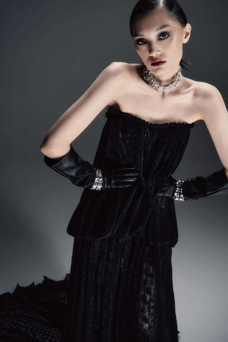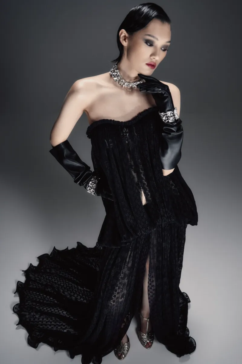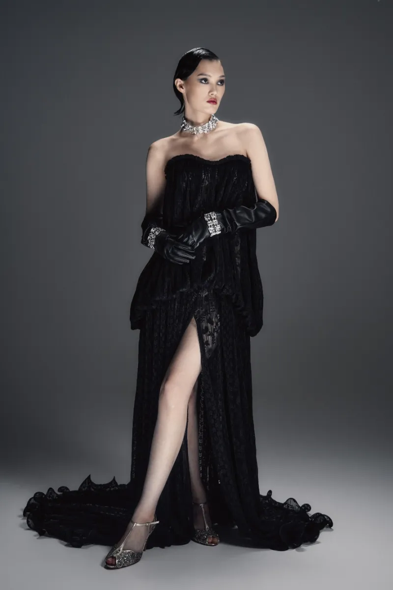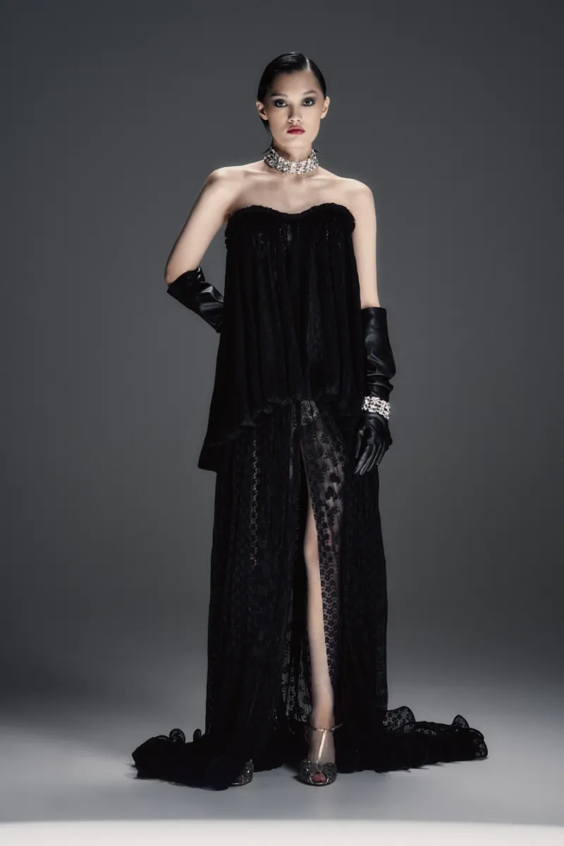 Зрелищное платье макси прямого силуэта со шлейфом и полупрозрачным рельефным корсетом с моночашкой. Мягкая драпировка на лифе подчёркивает пластичность формы. Прямая юбка украшена сборкой у талии, имеет центральный разрез и волнистый подол. В комплект входят шортики в нейтральном пудровом оттенке.