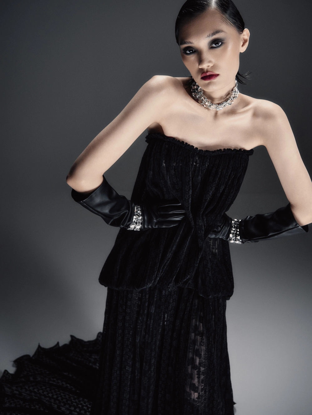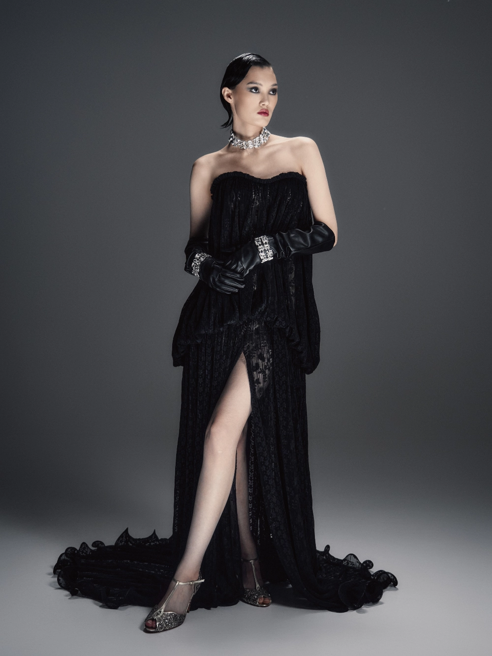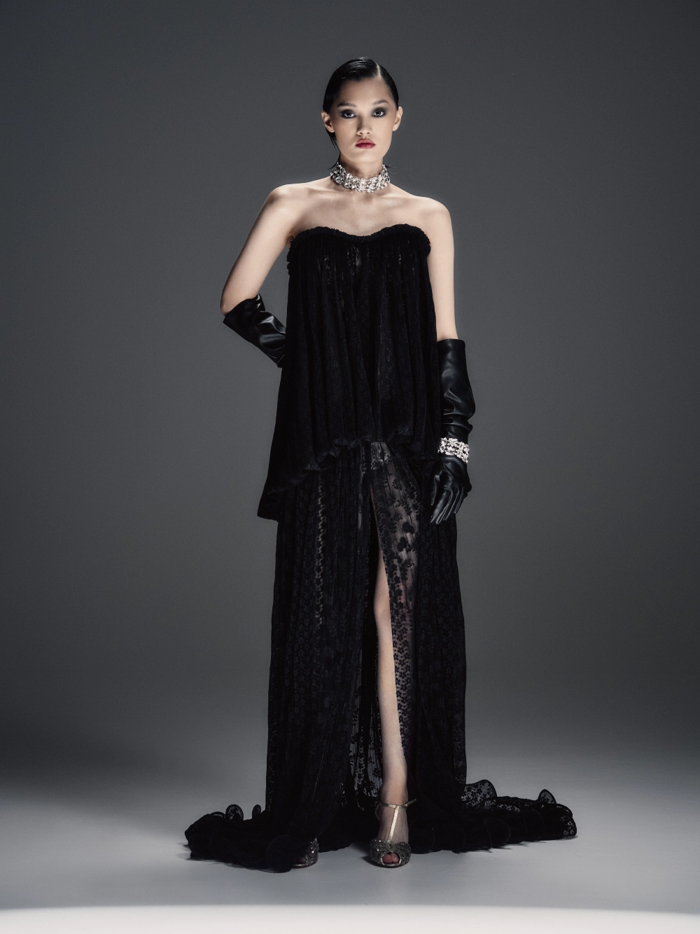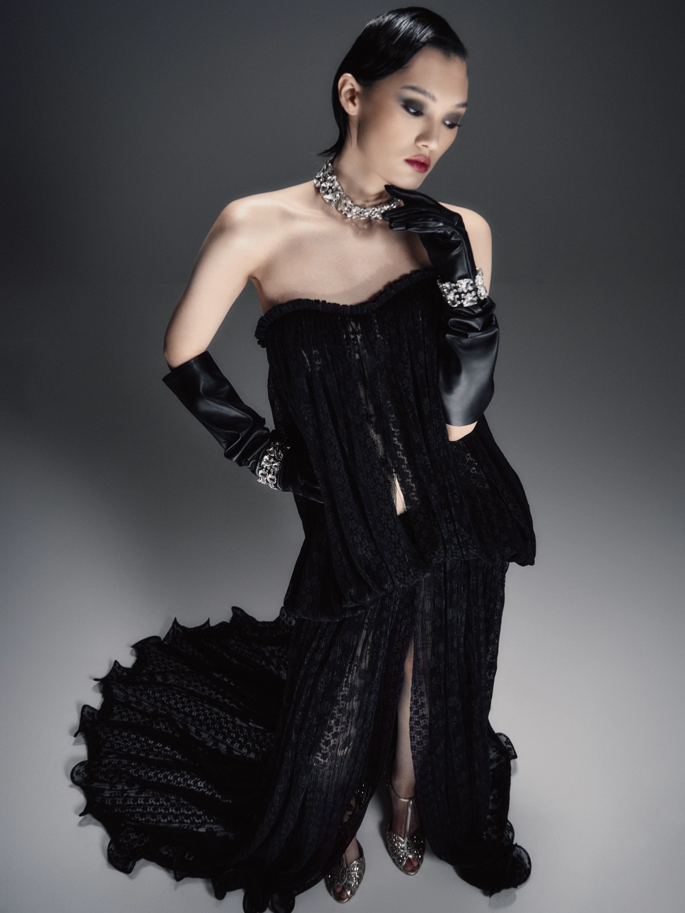 Зрелищное платье макси прямого силуэта со шлейфом и полупрозрачным рельефным корсетом с моночашкой. Мягкая драпировка на лифе подчёркивает пластичность формы. Прямая юбка украшена сборкой у талии, имеет центральный разрез и волнистый подол. В комплект входят шортики в нейтральном пудровом оттенке.