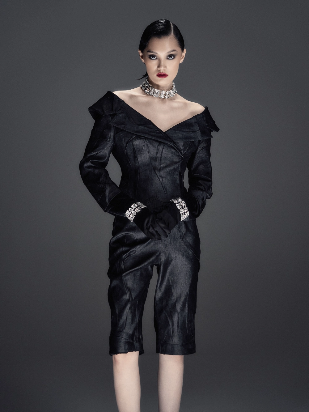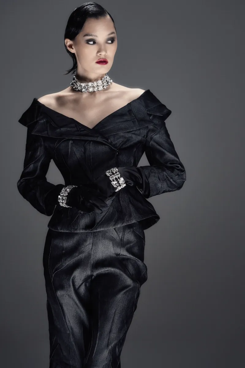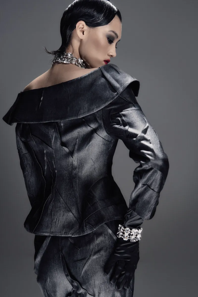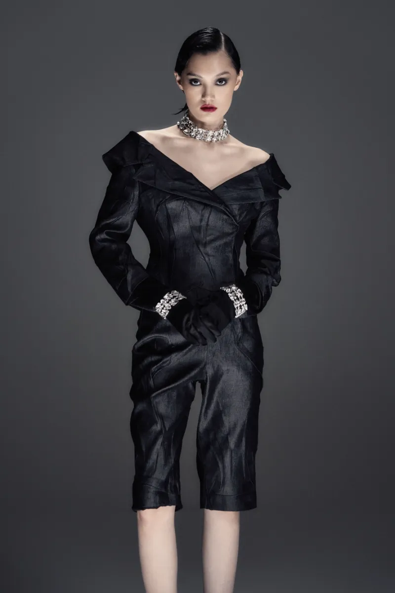 Минималистичный ансамбль из фактурной жатой костюмной ткани. Приталенный жакет со спущенной линией плеча формирует чистый силуэт, а миди-шорты с боковой потайной застёжкой создают гармоничный, лаконичный образ.