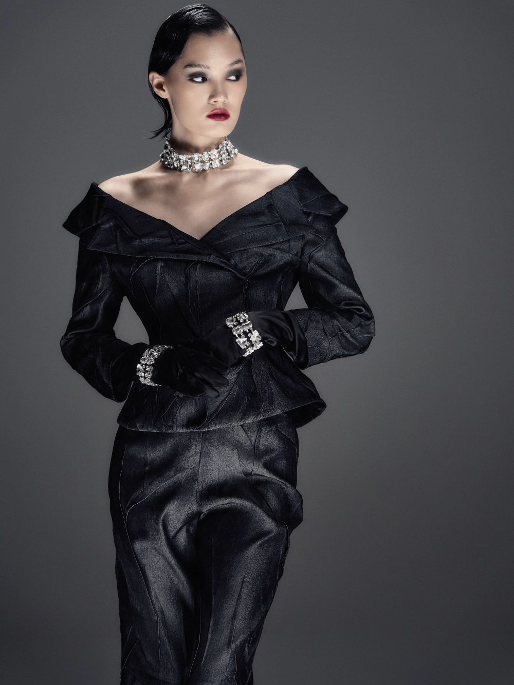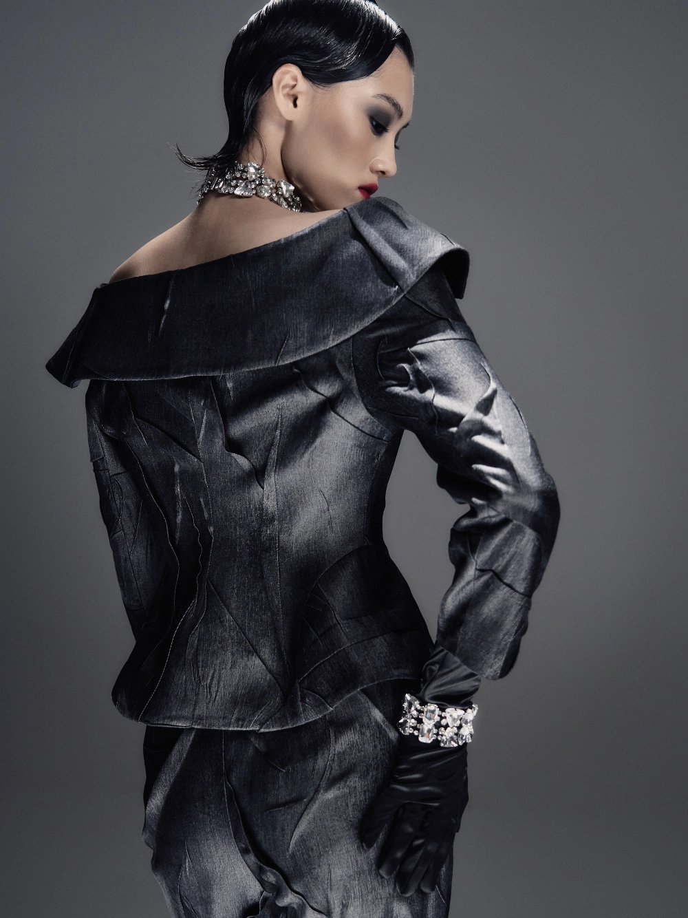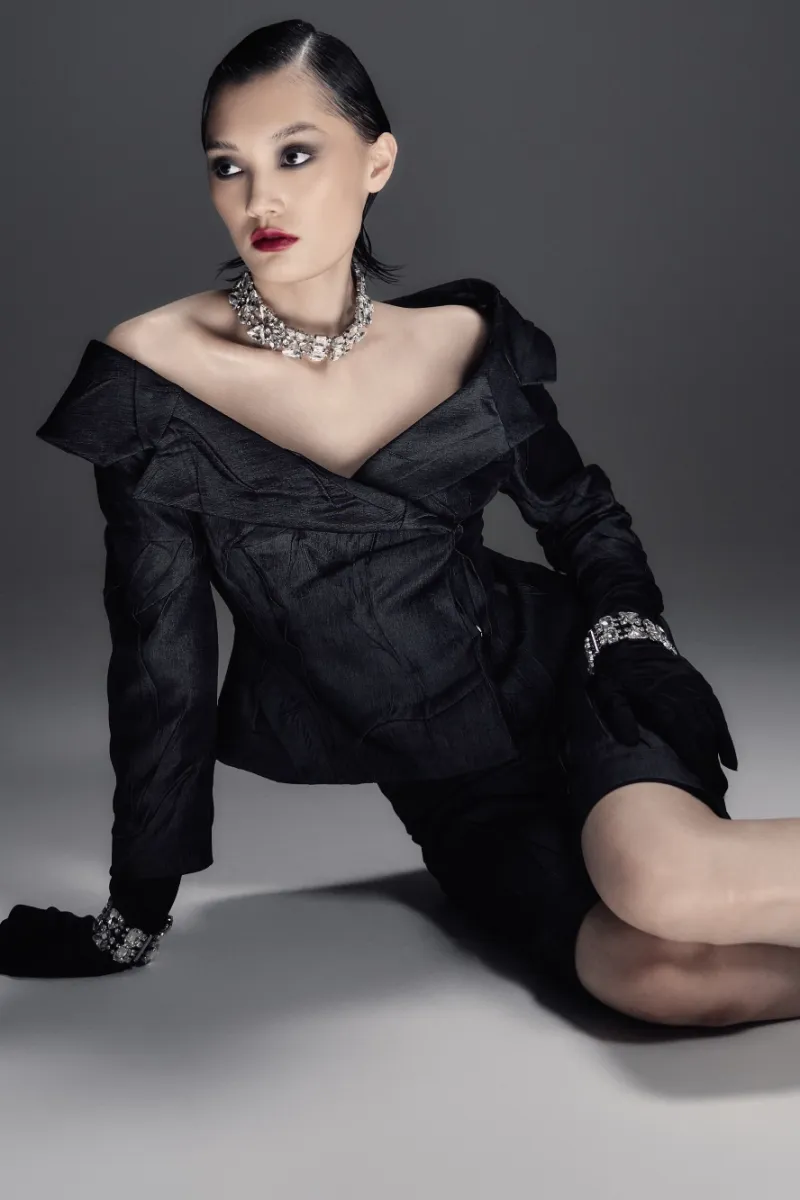Минималистичный ансамбль из фактурной жатой костюмной ткани. Приталенный жакет со спущенной линией плеча формирует чистый силуэт, а миди-шорты с боковой потайной застёжкой создают гармоничный, лаконичный образ.