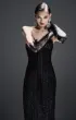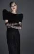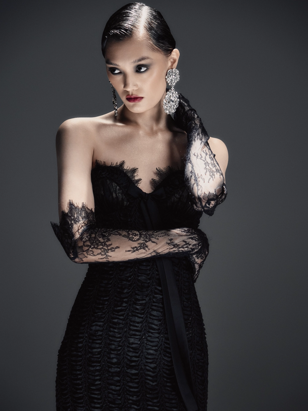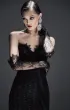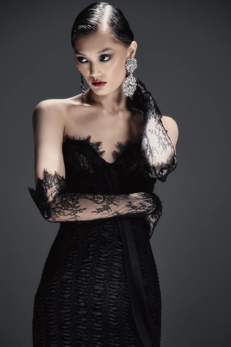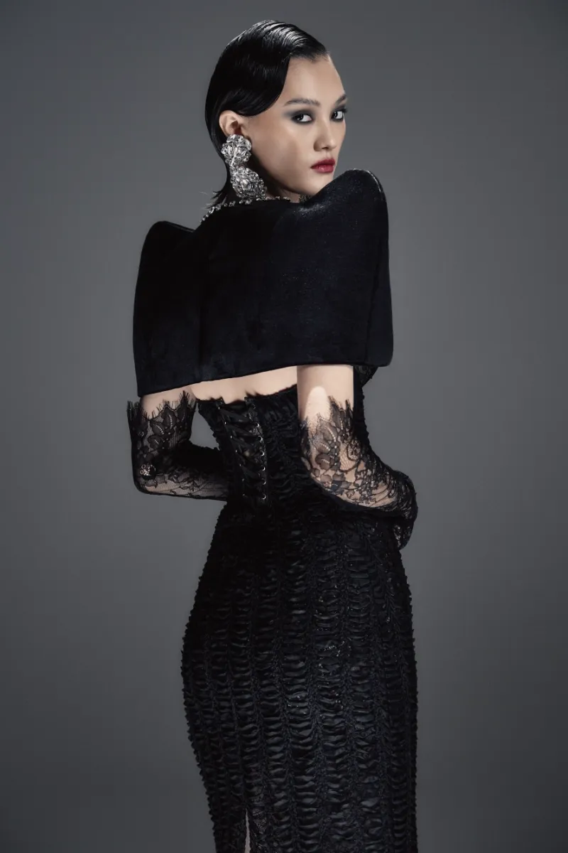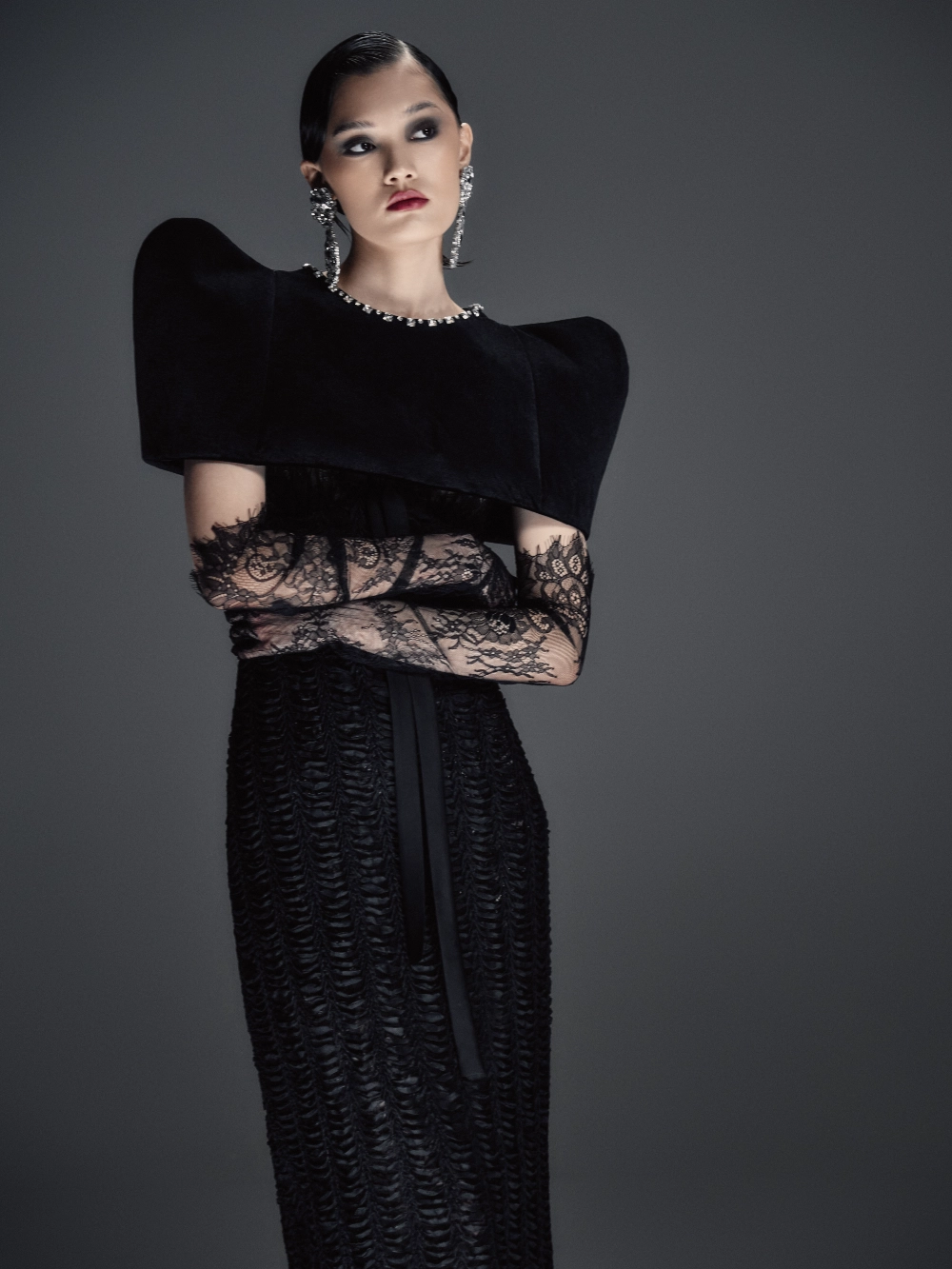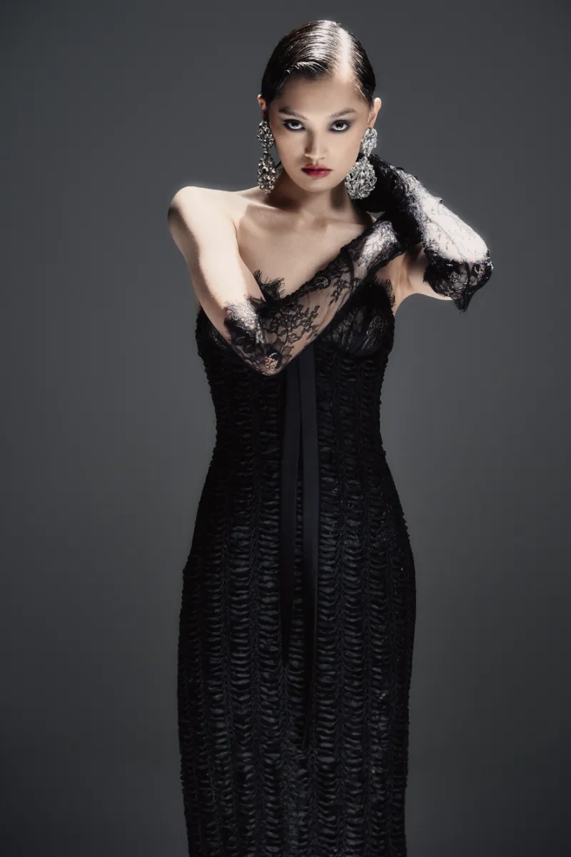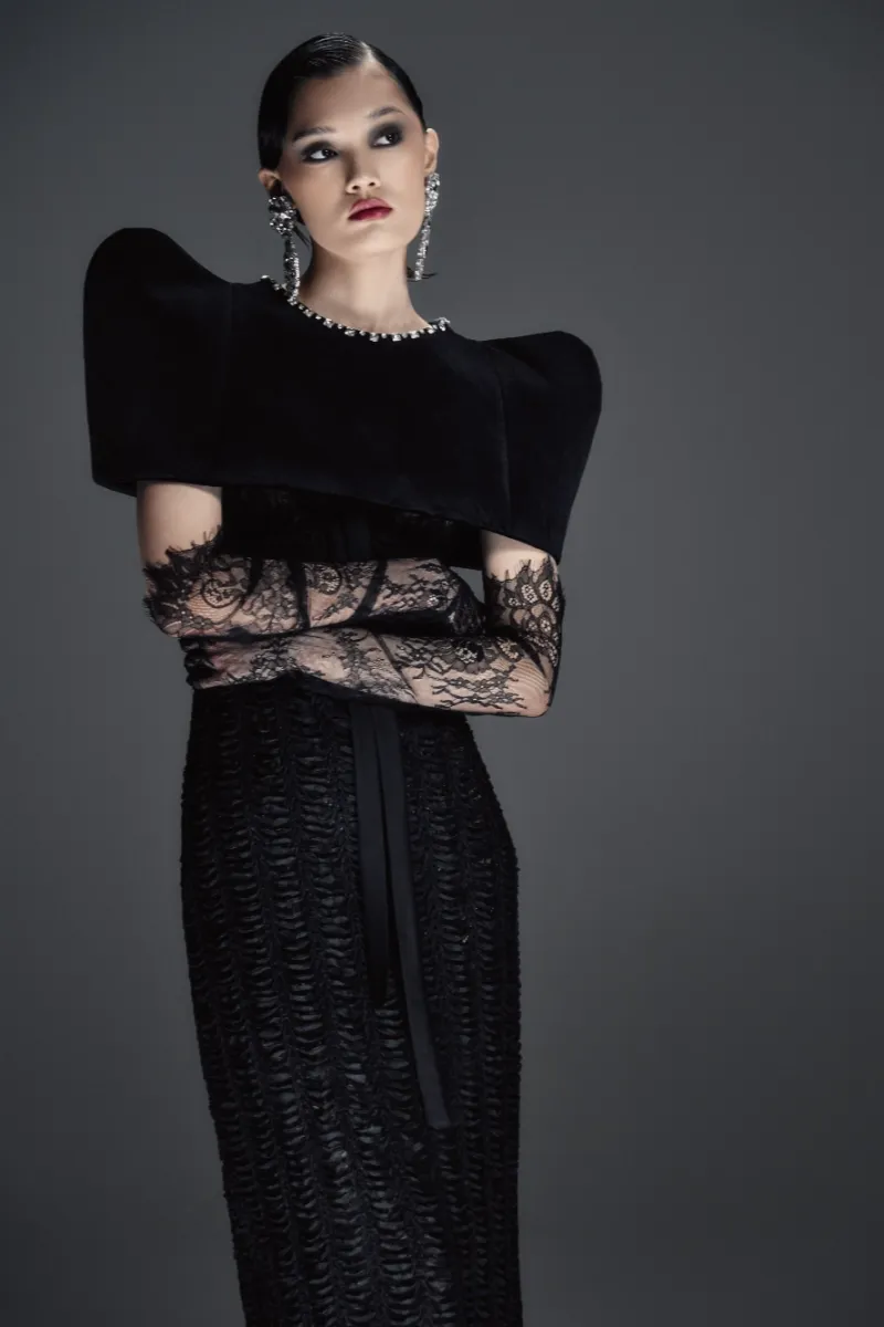 Бархатное корсетное платье с точёными чашками, покрытыми лёгким кружевом шантильи и выразительным фестоном. На спинке — открытая шнуровка, скрытая под ней молния и смелый разрез. Кейп — воздушный и скульптурный, с фантазийной формой плеча, шелковой подкладкой и украшением у горловины в виде сияющего стразового колье.